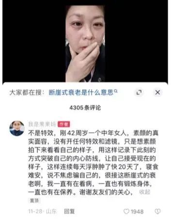 近日,山东一位42岁女子发视频称自己在20天内经历了“断崖式衰老”,引发网友关注。