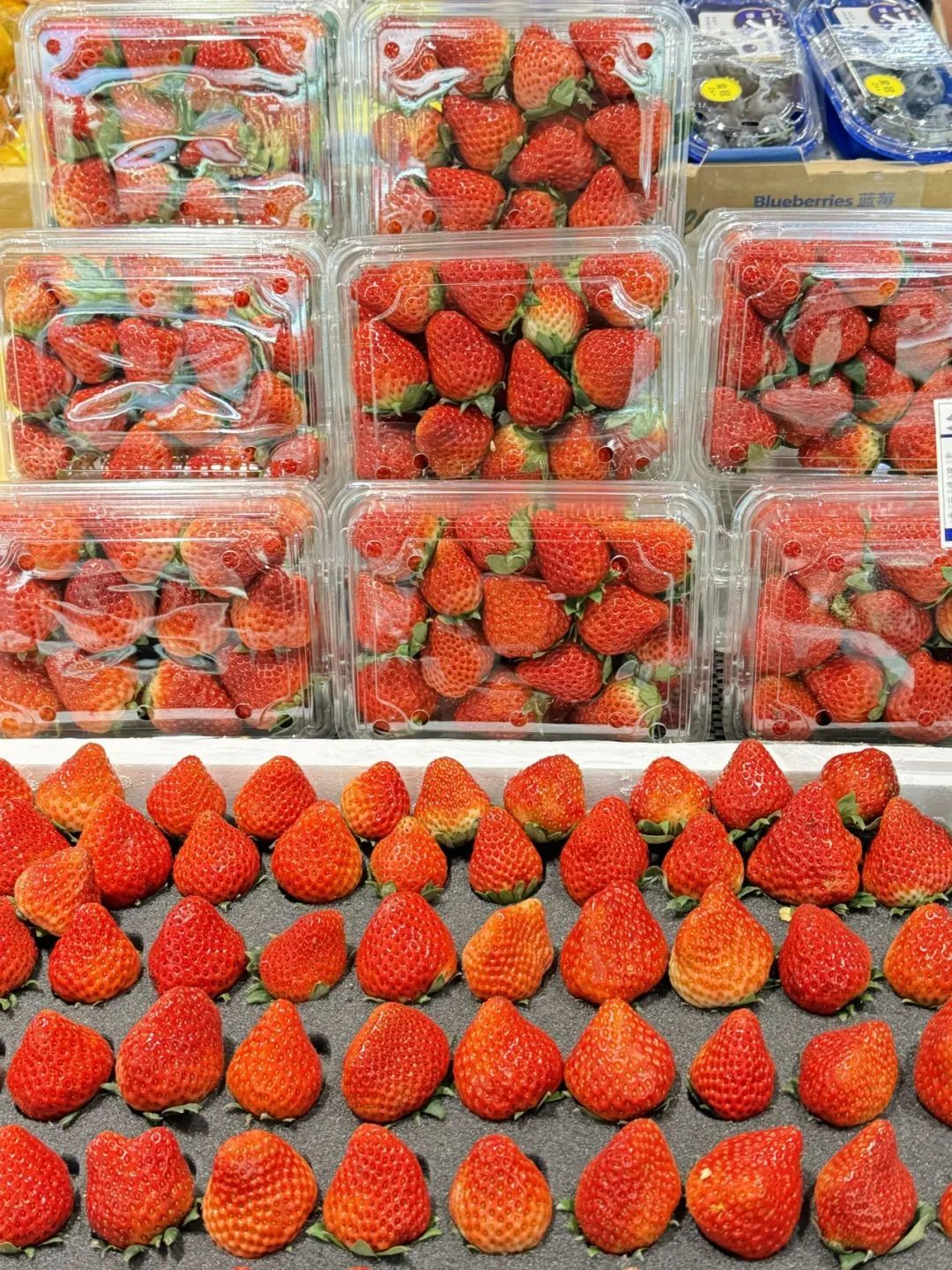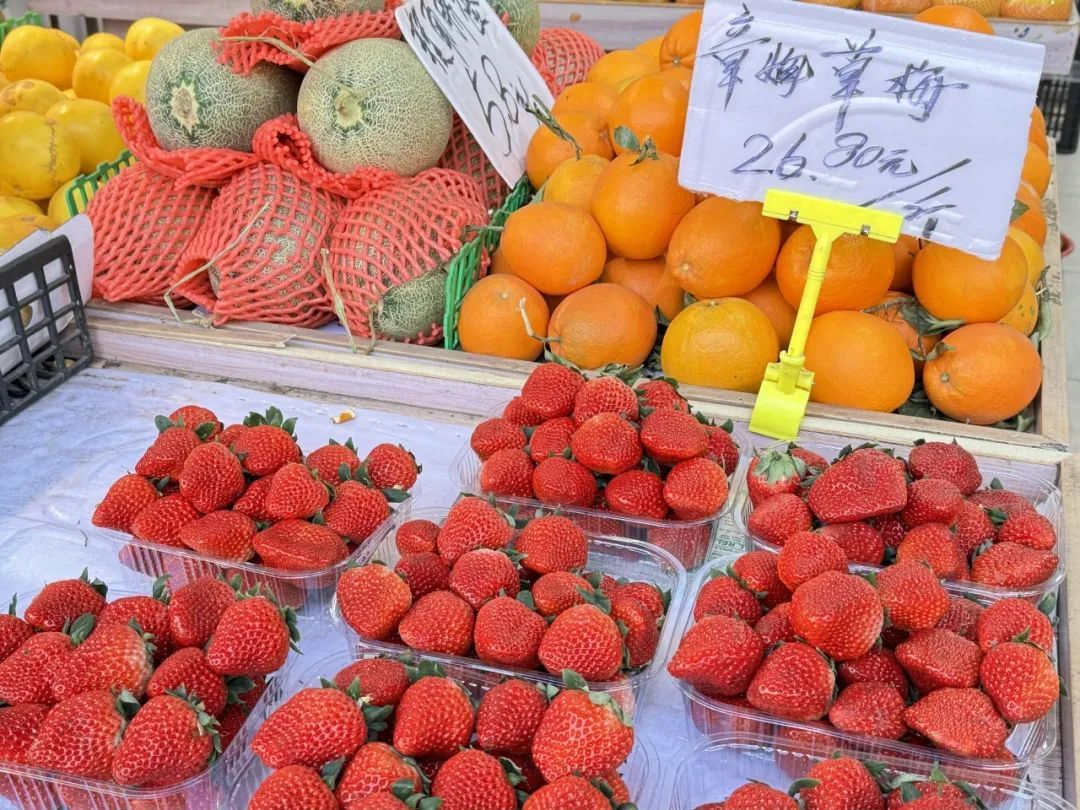 在武定菜市场,各个水果摊的最前方都整齐地摆放了应季时鲜货,一颗颗红彤彤的草莓色泽红润,个头饱满。