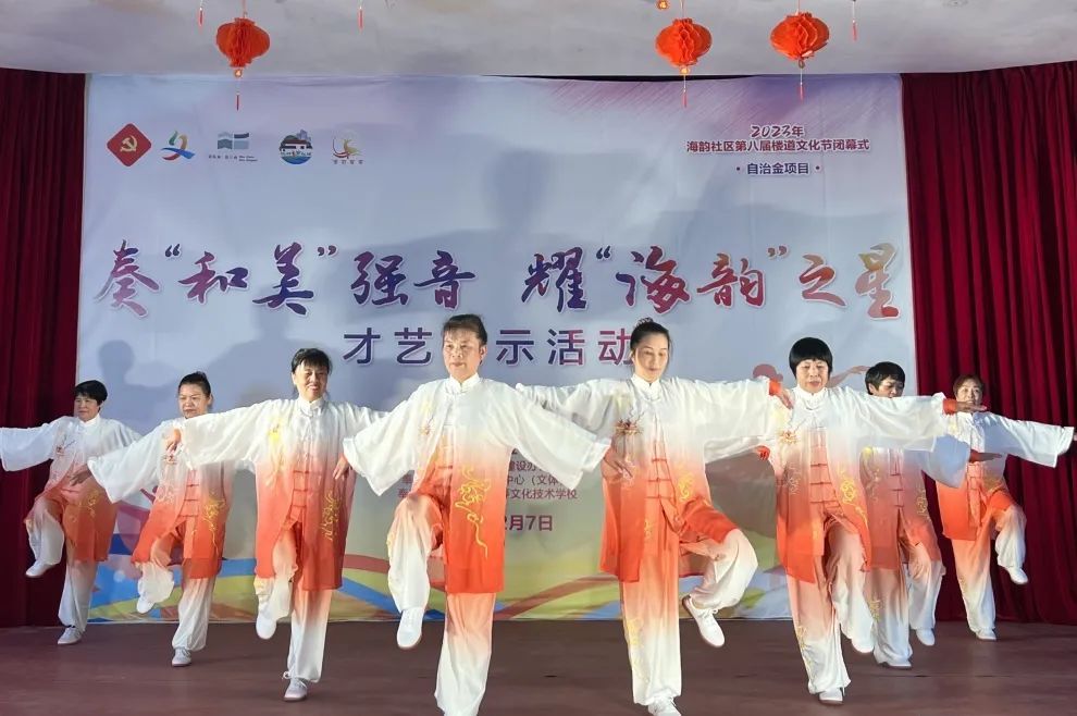 值得一提的是,本次活动的展演节目从创作到排练到表演,都由社区牵头,社区居民自编自导、打磨完成,内容围绕爱国主义思想、社区建设、居民自治等,充分展示了海韵社区的新风貌。