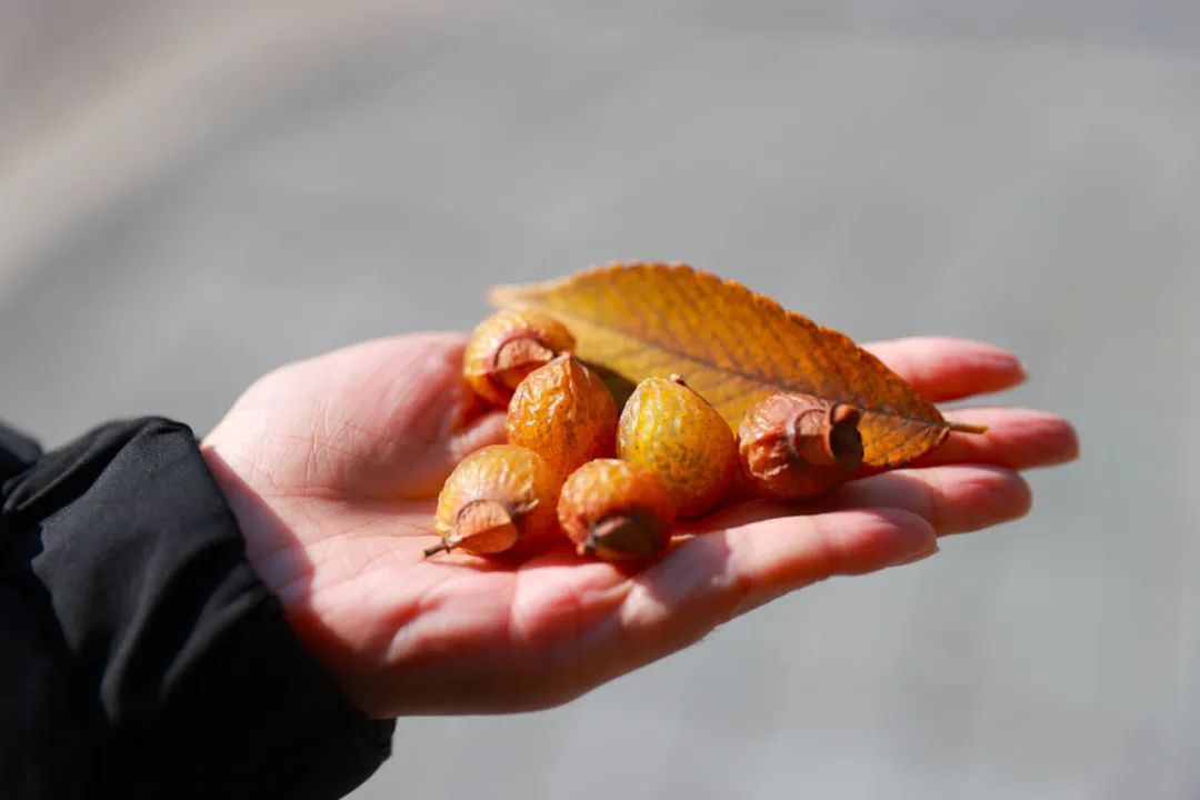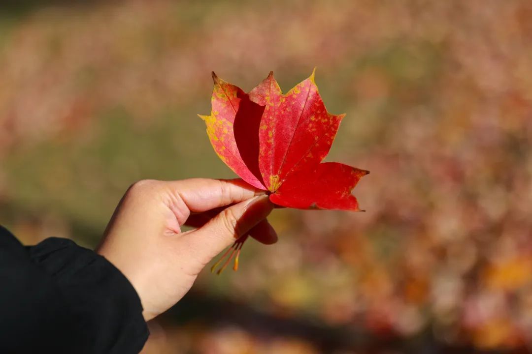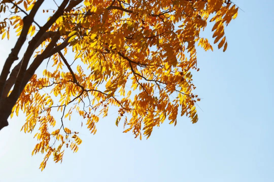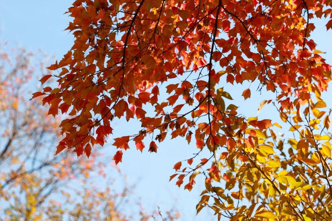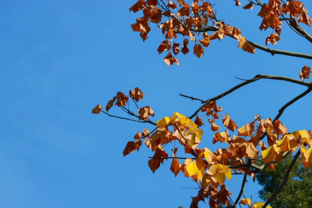 江学路两旁的无患子枝头挂满果实,叶色已经变得金黄。走进中央绿带,停车场入口处的几棵三角枫格外引人注目,抬头看,阳光下绿色、黄色、橙色、红色依次渐变,让一棵树同时拥有了整个四季的颜色。低下头,落叶为草地铺上了厚厚一层地毯,踩上去发出清脆的沙沙声。