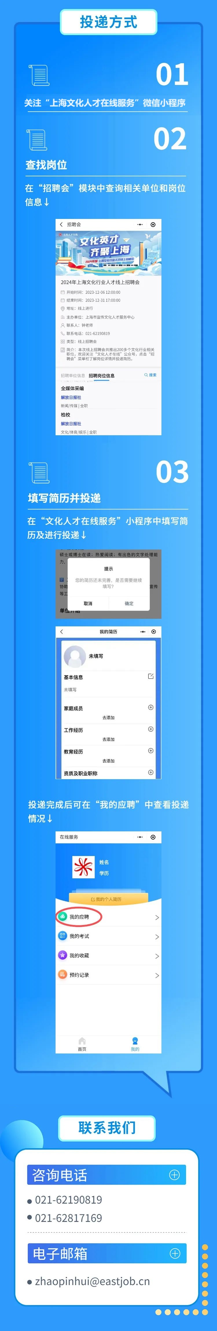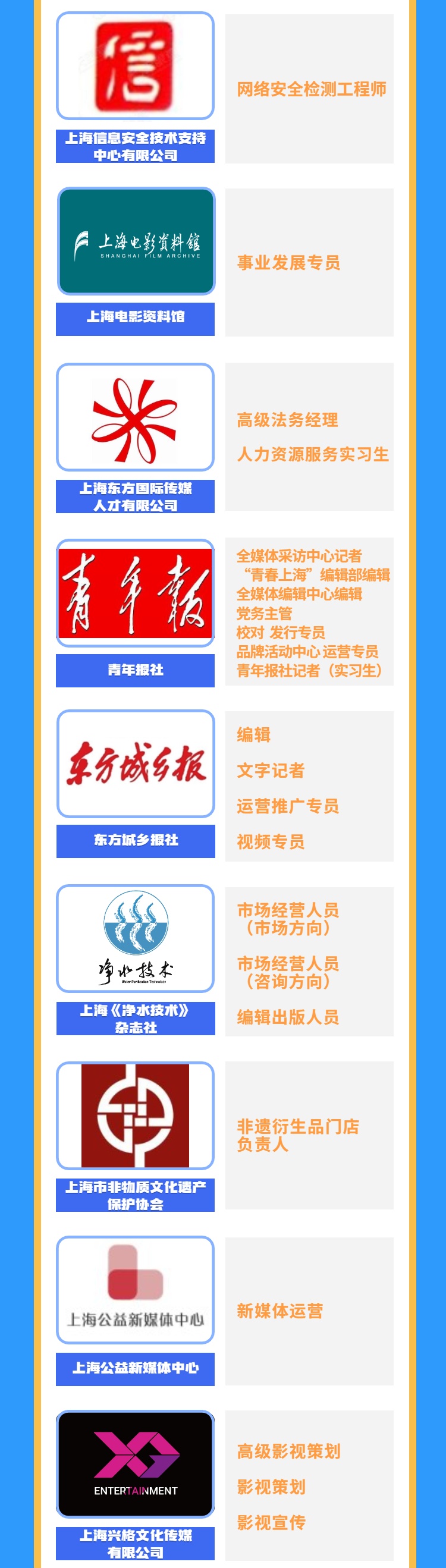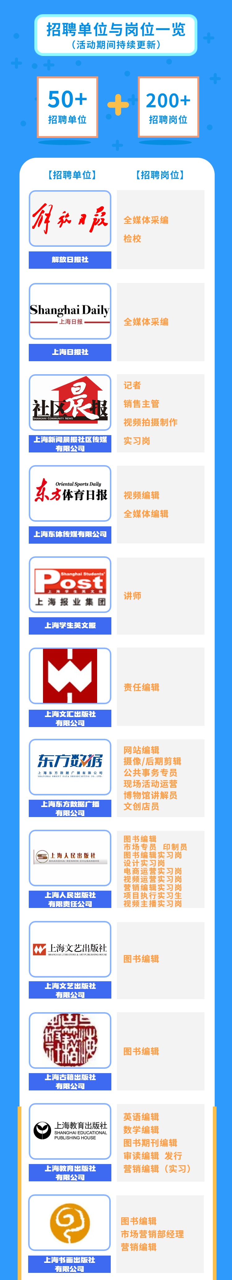 由上海市宣传文化人才服务中心主办的“2024年上海文化行业人才线上招聘会”正式启动。本次线上招聘会共推出200多个文化行业相关招聘职位,招聘单位包括解放日报社、上海日报社上海世纪出版集团旗下多家单位,世博会博物馆、上海市宛平艺苑等近50家上海市知名文化行业企事业单位,包含新闻版类、新媒体运营类、管理类、企划宣传类、职能类、IT类等众多岗位。有意者可于12月底前进行简历投递,详见↓