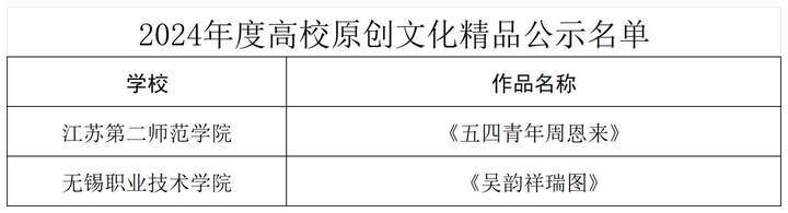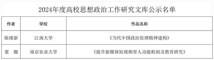 在思政工作项目方面,南京大学“‘博’讲中国故事——高校博士生讲师团‘三维双向’实践育人路径探索”等7个项目入选2024年度高校思想政治工作精品项目公示名单,江南大学《当代中国政治伦理精神建构》等2个项目入选2024年度高校思想政治工作研究文库公示名单,江苏第二师范学院《五四青年周恩来》等2个项目入选2024年度高校原创文化精品公示名单。