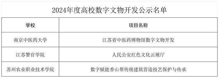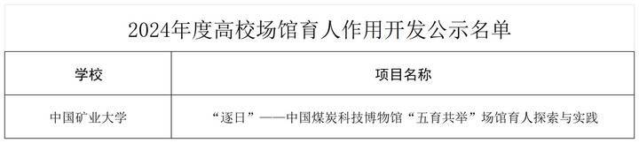在高校场馆育人项目方面,中国矿业大学“‘逐日’——中国煤炭科技博物馆‘五育共举’场馆育人探索与实践”入选2024年度高校场馆育人作用开发公示名单,南京中医药大学“江苏省中医药博物馆数字文物开发”等3个项目入选2024年度高校数字文物开发公示名单,东南大学“‘江宁——昆山’中国式现代化教育实践体验基地”等2个项目入选2024年度全国高校综合性教育实践体验基地公示名单。