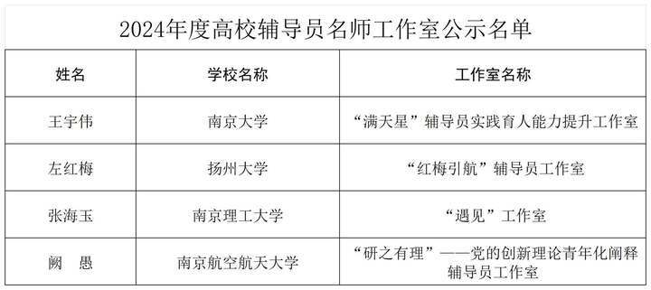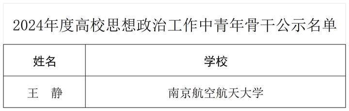 在高校思政工作优秀工作者方面,南京航空航天大学教师王静入选2024年度高校思想政治工作中青年骨干公示名单,南京大学“‘满天星’辅导员实践育人能力提升工作室”等4个项目入选2024年度高校辅导员名师工作室公示名单。