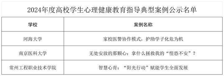 在心理健康教育方面,河海大学“家校医警协作模式,护助学子化危为机”等3个项目入选2024年度高校学生心理健康教育指导典型案例公示名单。