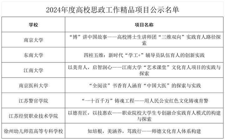 交汇点讯 12月7日,教育部公示2024年度高校思想政治工作质量提升综合改革与精品建设项目遴选结果,江苏多个高校项目入选。