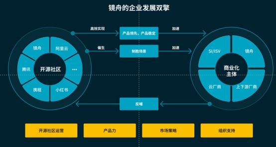 为了保持创新和用户需求之间的平衡。镜舟科技采用开源与商业化“双擎驱动”的战略。简单来说,就是从开源中来,由商业化来进行孵化,最后商业化的公司再去回馈到开源社区里面去。