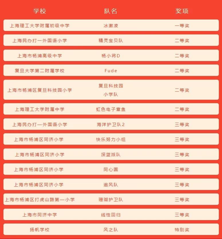 另外,来自上海民办打—外国语小学、上海同济小学、上海同济中学、上海市杨浦区打虎山路第—小学的7支队伍荣获三等奖;扬帆学校获得特别奖;杨浦区青少年科技站也因积极组织发动学校参与DI赛事,荣获优秀组织奖。