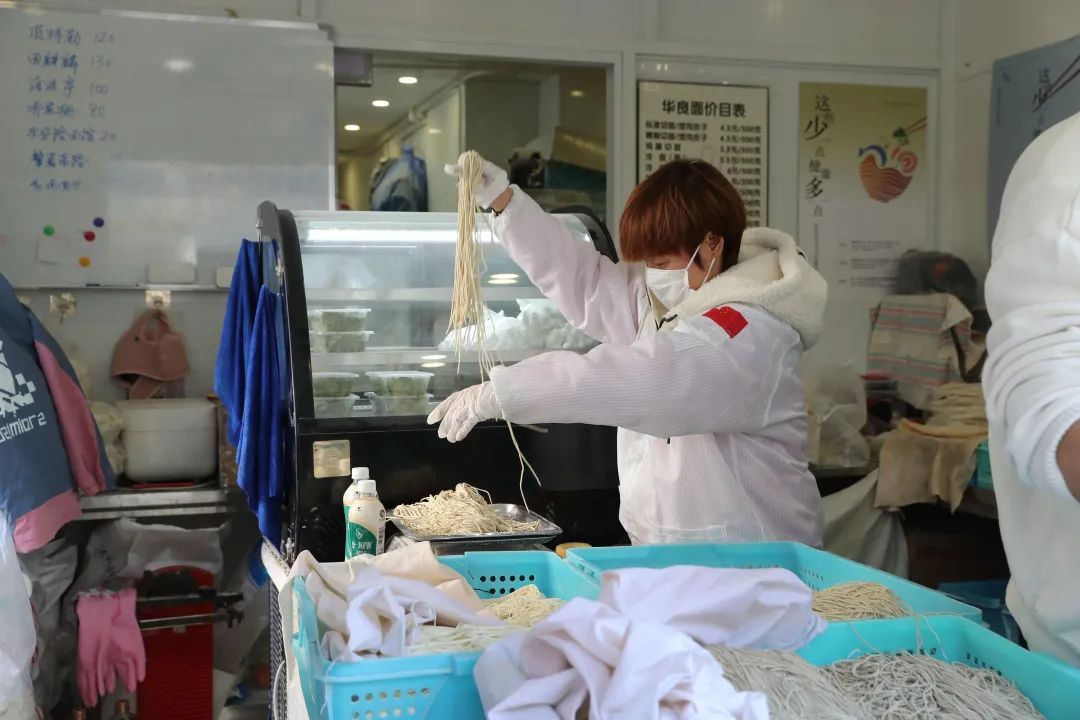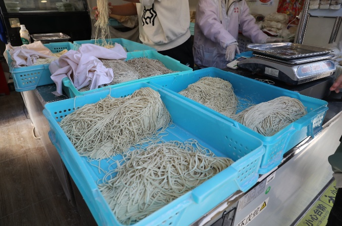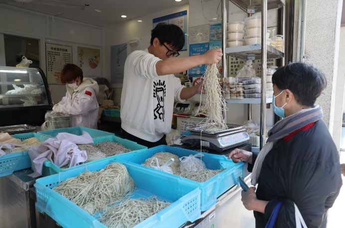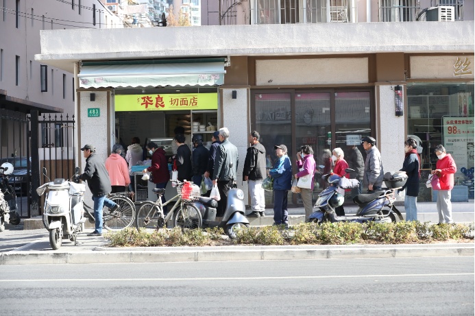 上午10点左右,小店门前顾客已经排起队。记者注意到,络绎不绝的顾客让排着的队伍始终没有间断,市民们或是买一袋切面,或是买一袋馄饨皮。看见记者拍照,一位老阿姨主动说道,“这家的切面好呀,物美价廉!”