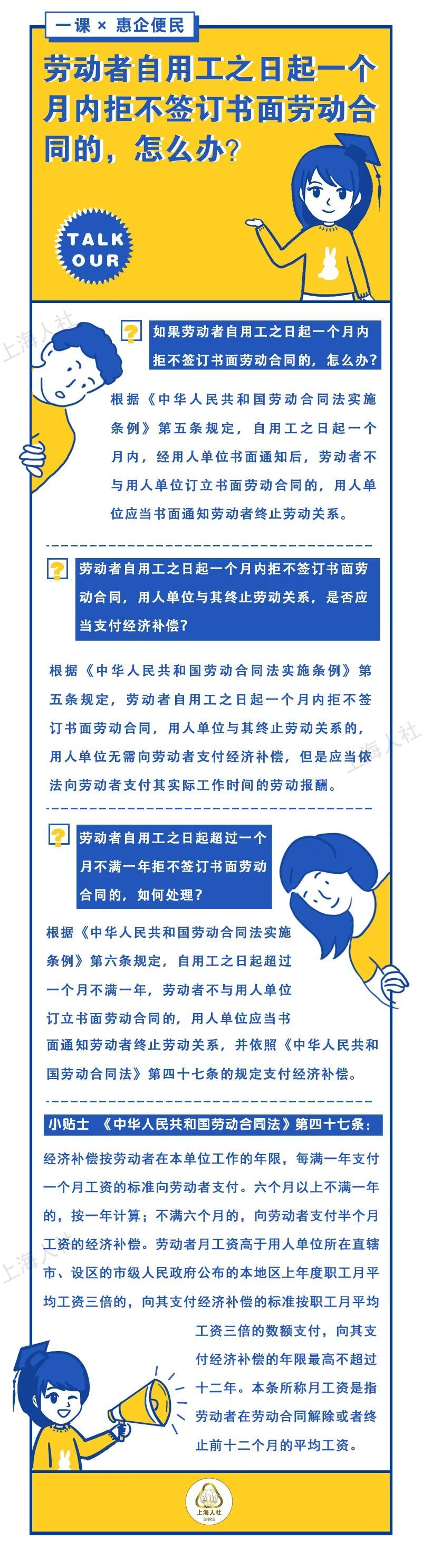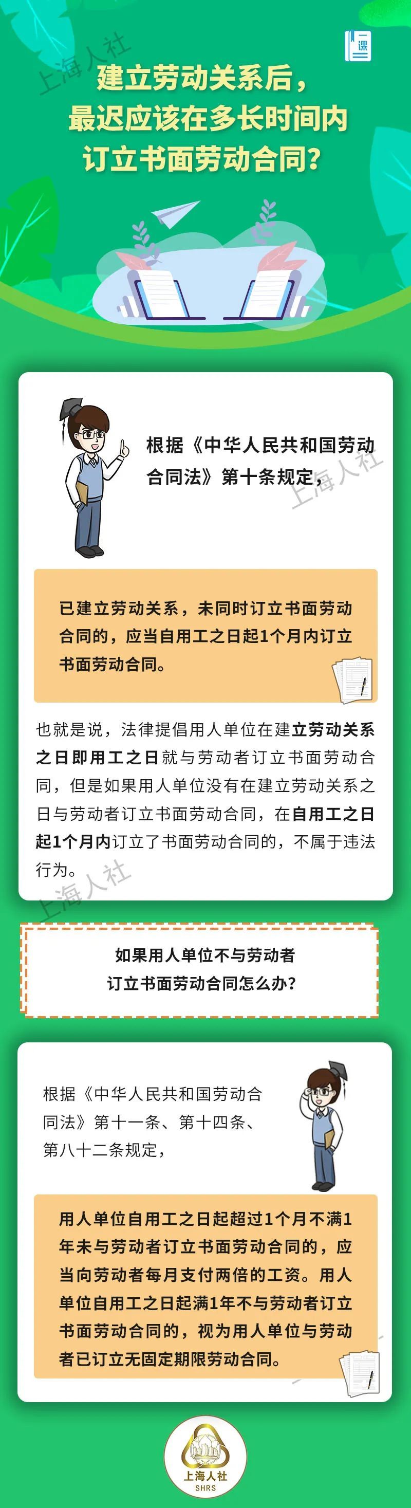 建立劳动关系后,最迟应该在多长时间内订立书面劳动合同?劳动者自用工之日起一个月内拒不签订书面劳动合同的,怎么办?劳动合同的期限分为哪几种……这些关于劳动合同的订立与履行方面的问题。来看市人社局的解答↓