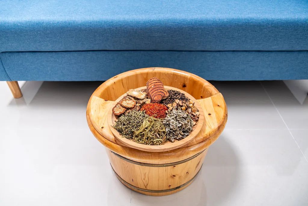 取艾叶、菖蒲、藿香、苍术、防风、苏叶各20克,加适量清水浸泡30分钟,然后再煎煮30分钟,温度适宜时将双足置于药液中,以药液热气熏蒸,汗出少许为宜。