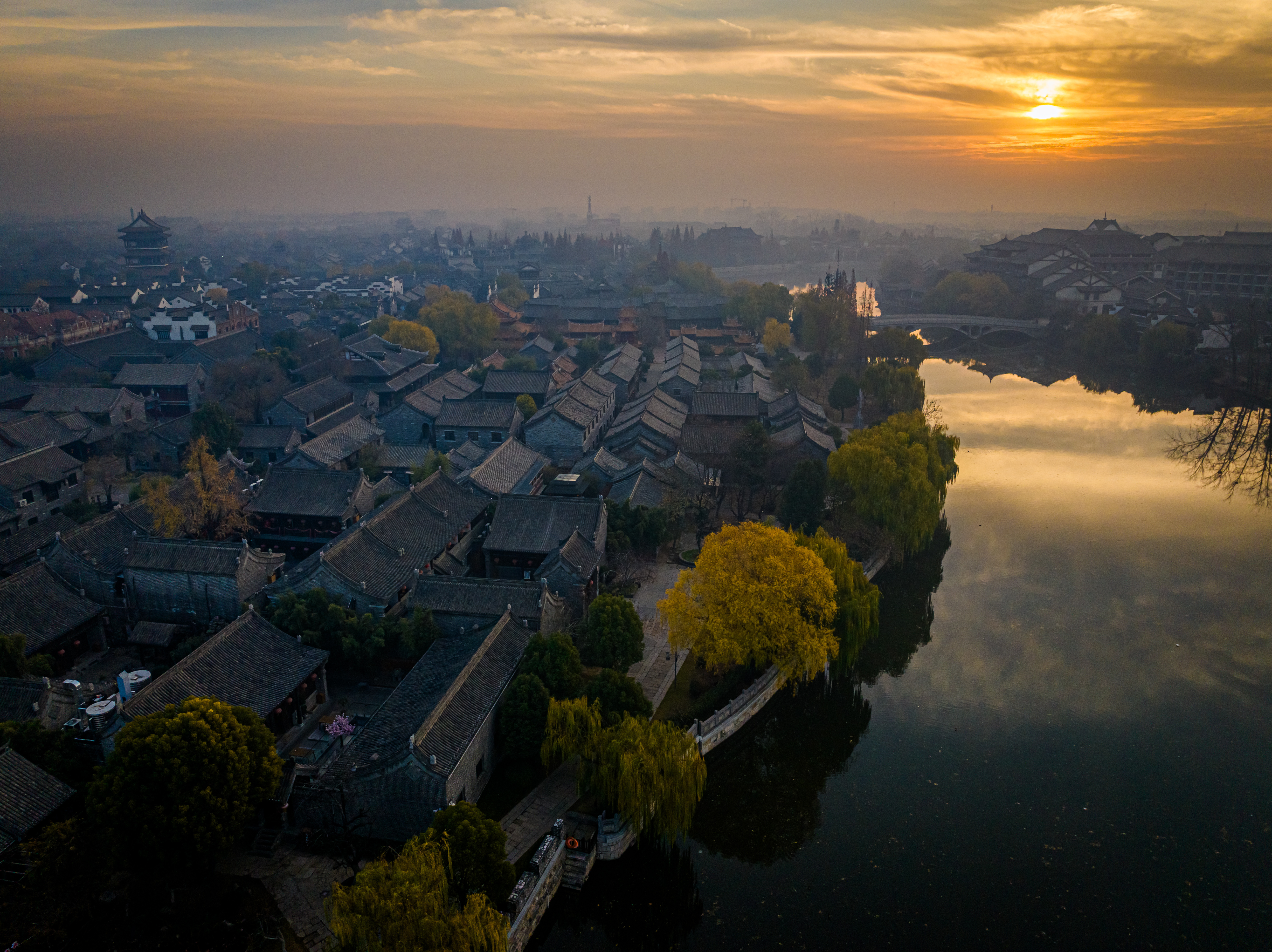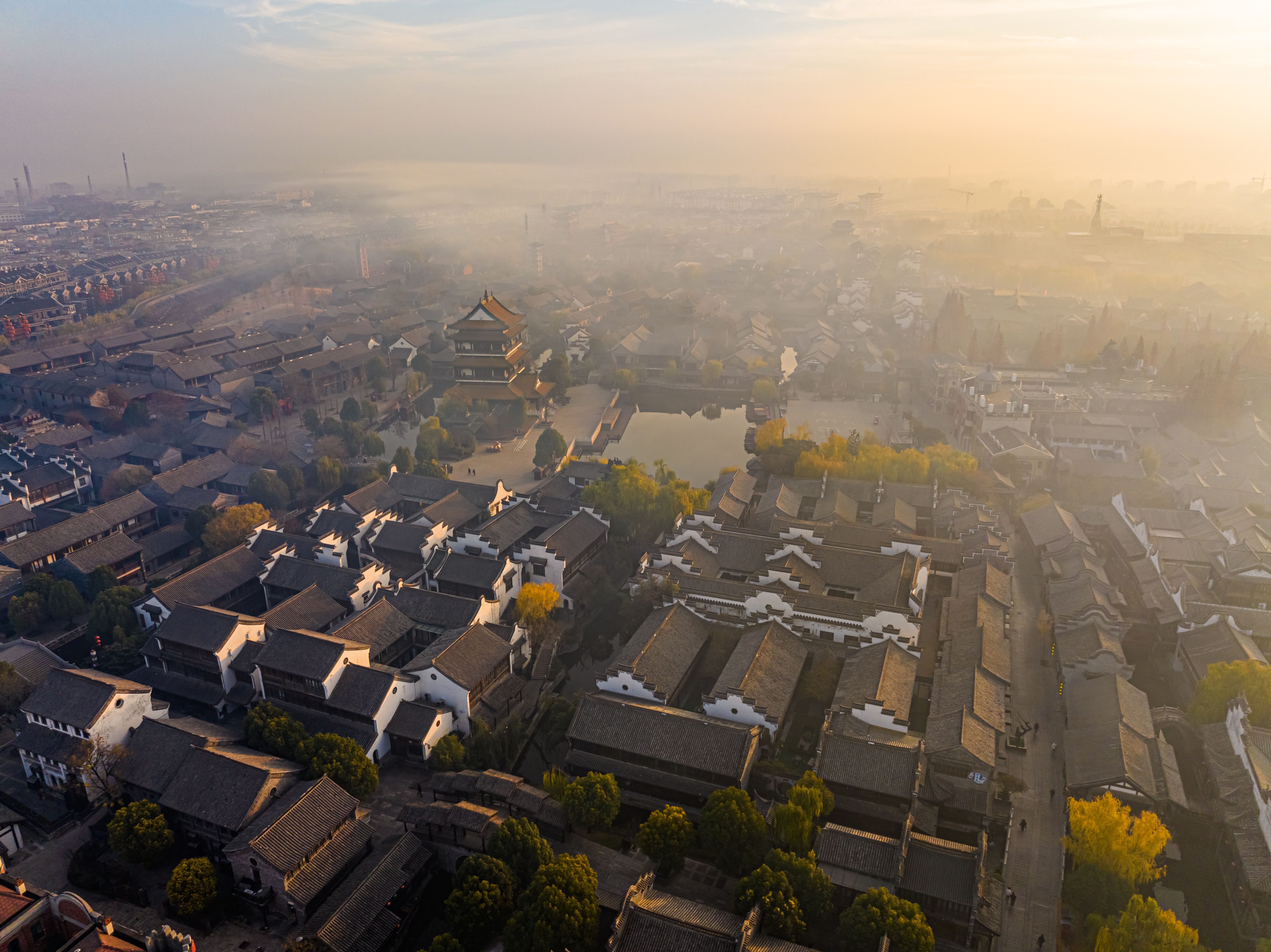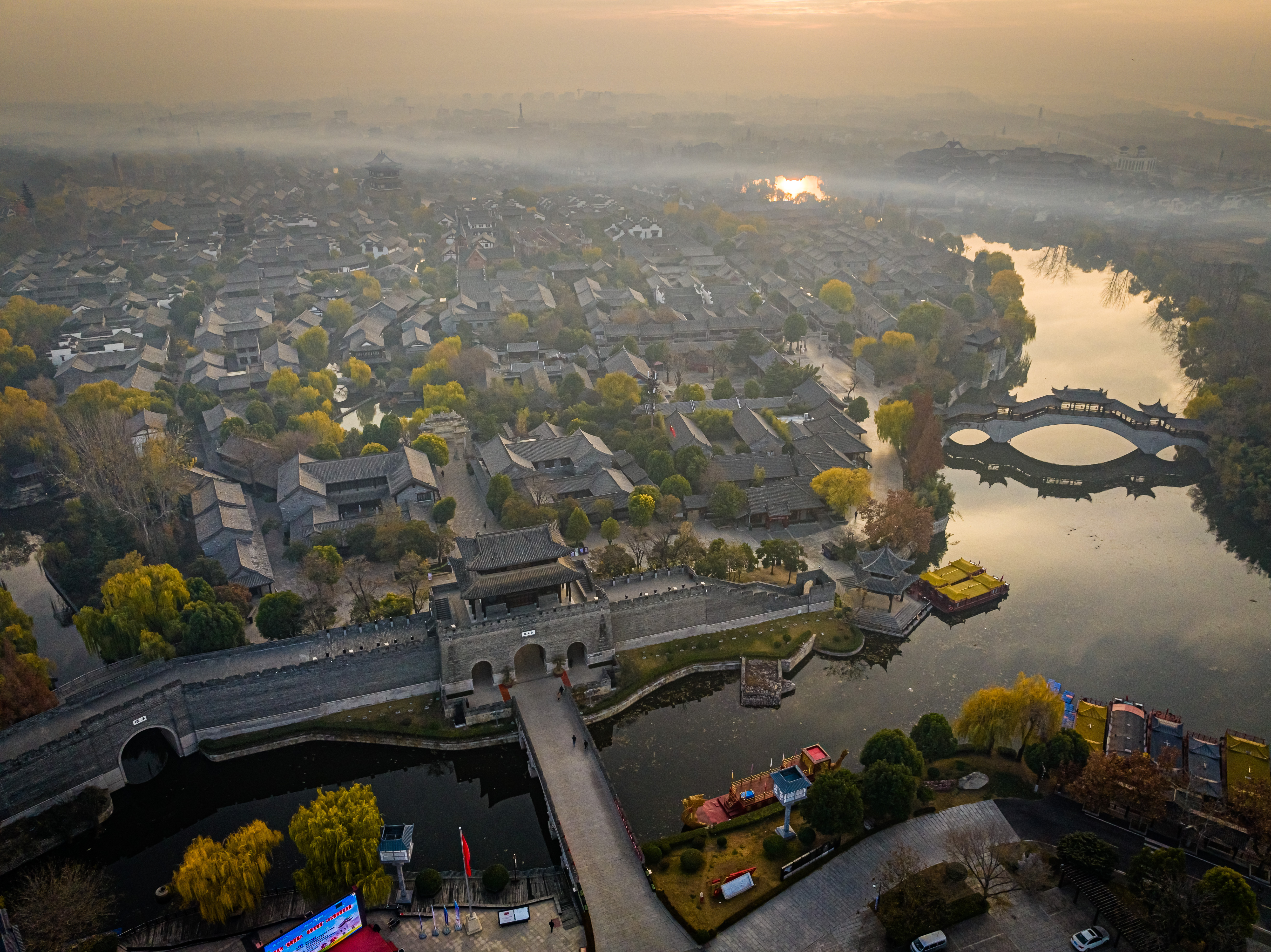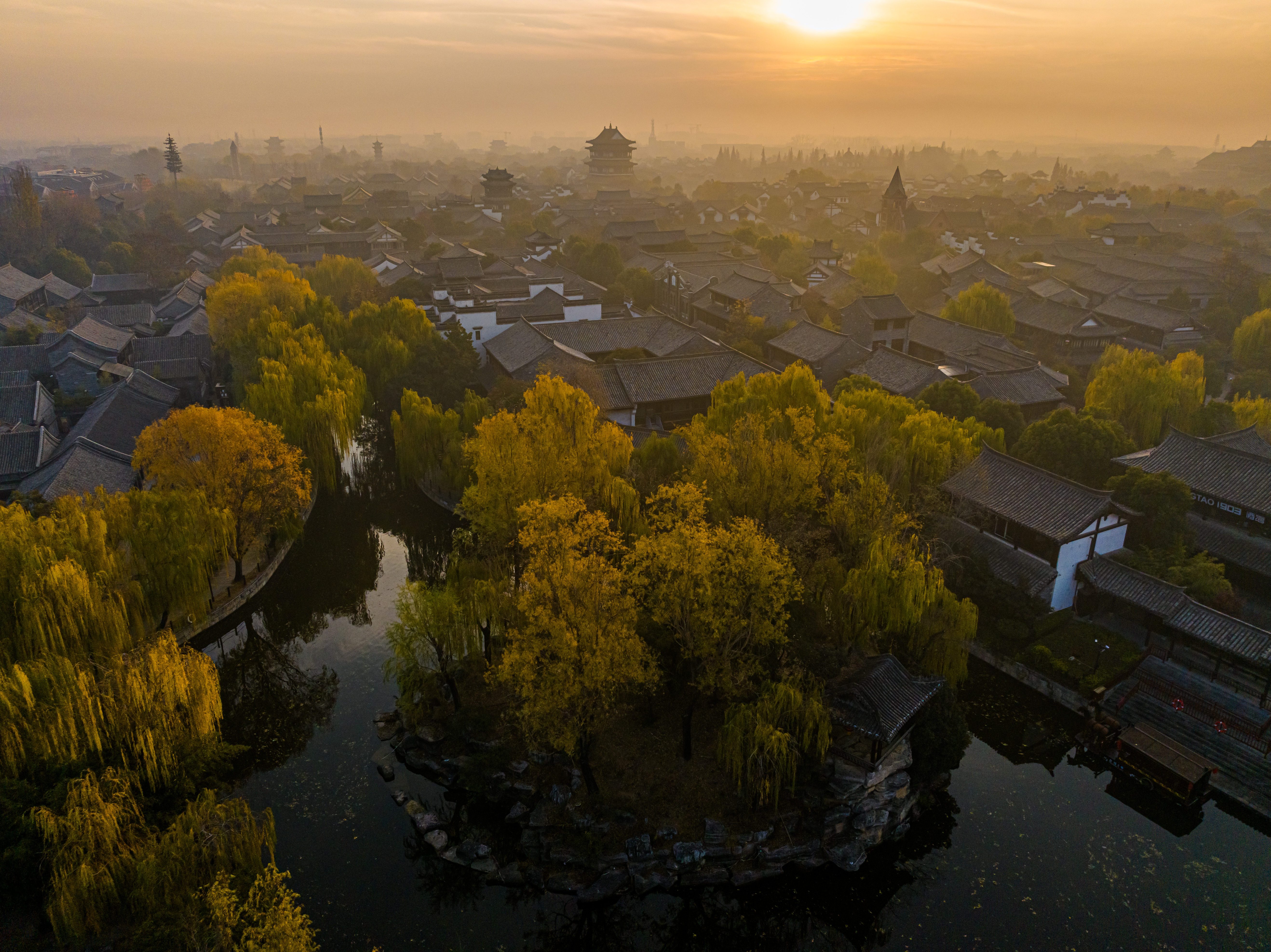 冬日的清晨,太阳刚刚升起,台儿庄古城仿佛被一层金色的光辉笼罩。阳光透过云层散射在古城上空,如梦如幻,让人感受到温暖和宁静。古运河与岸边的古建筑相映成趣,形成了一幅美丽的画卷。此时烟雾缭绕,整座城就像仙境一样,美不胜收。