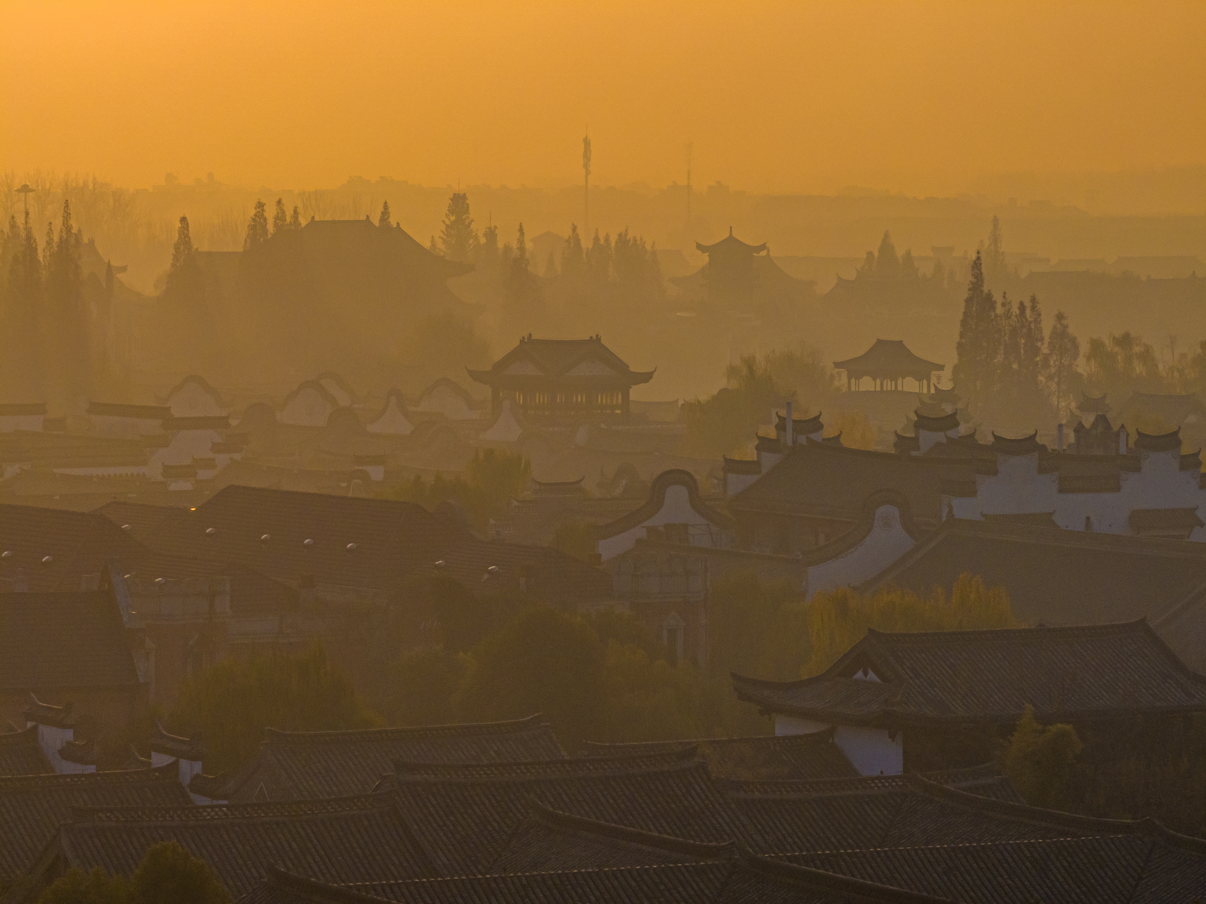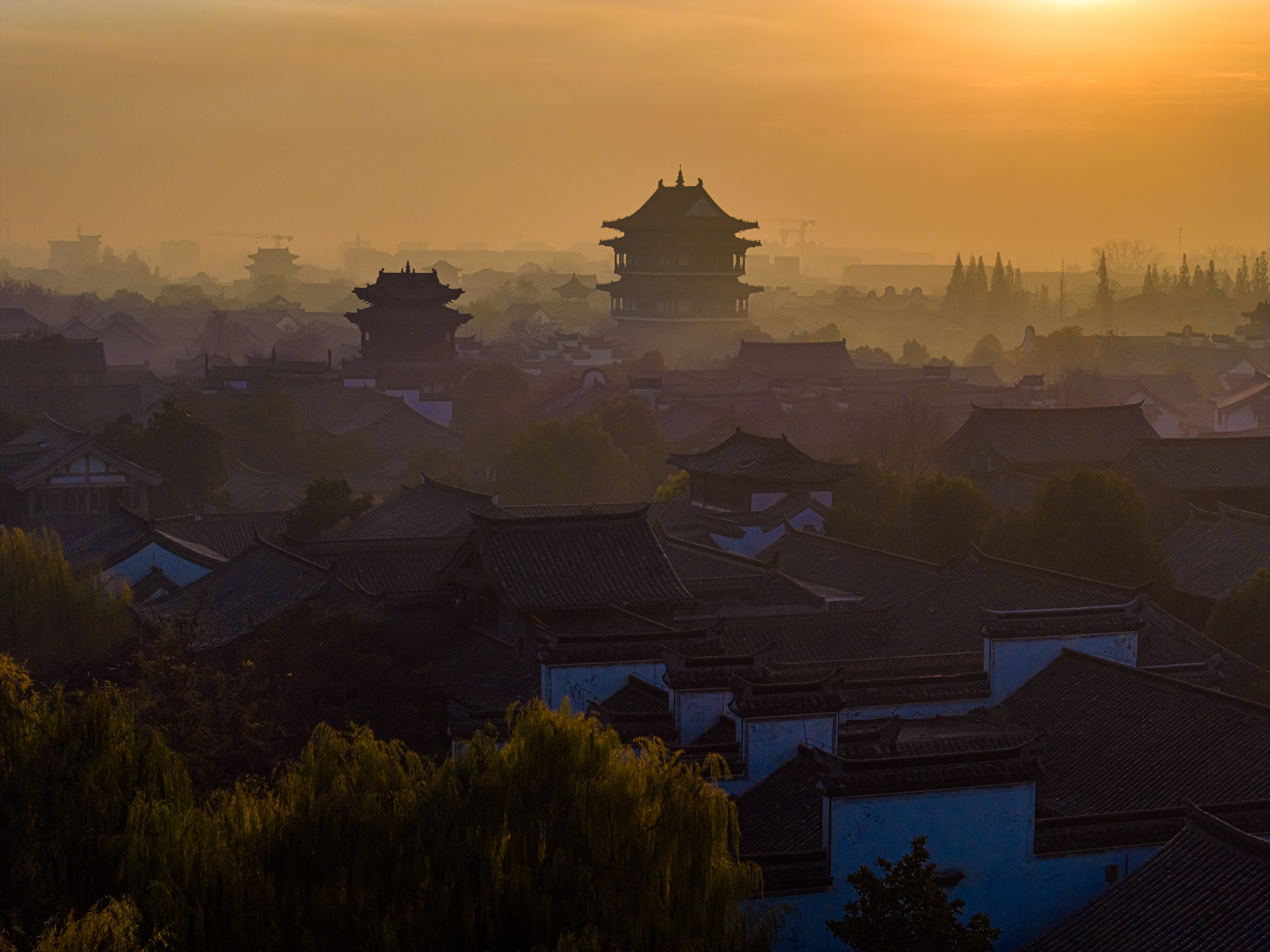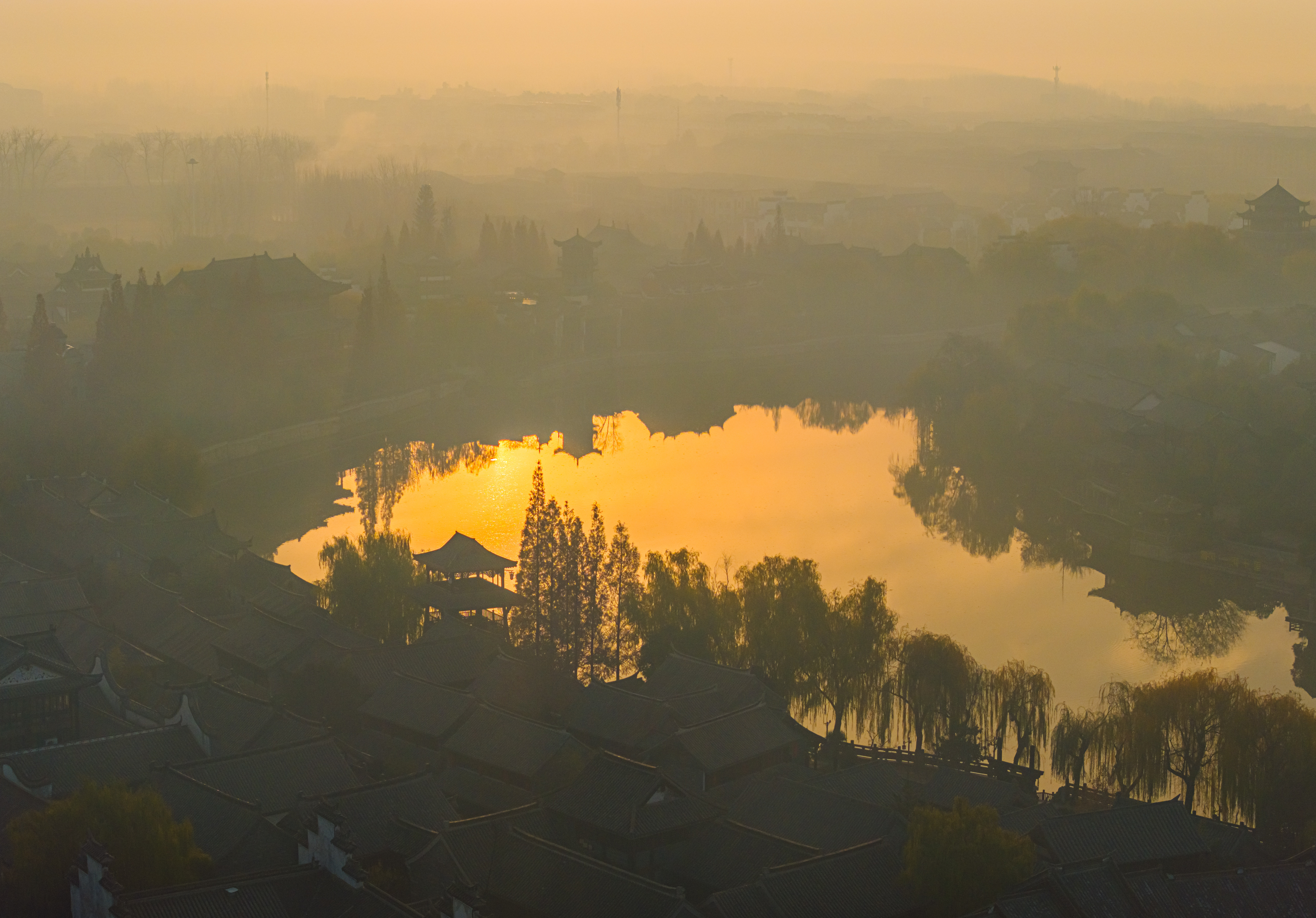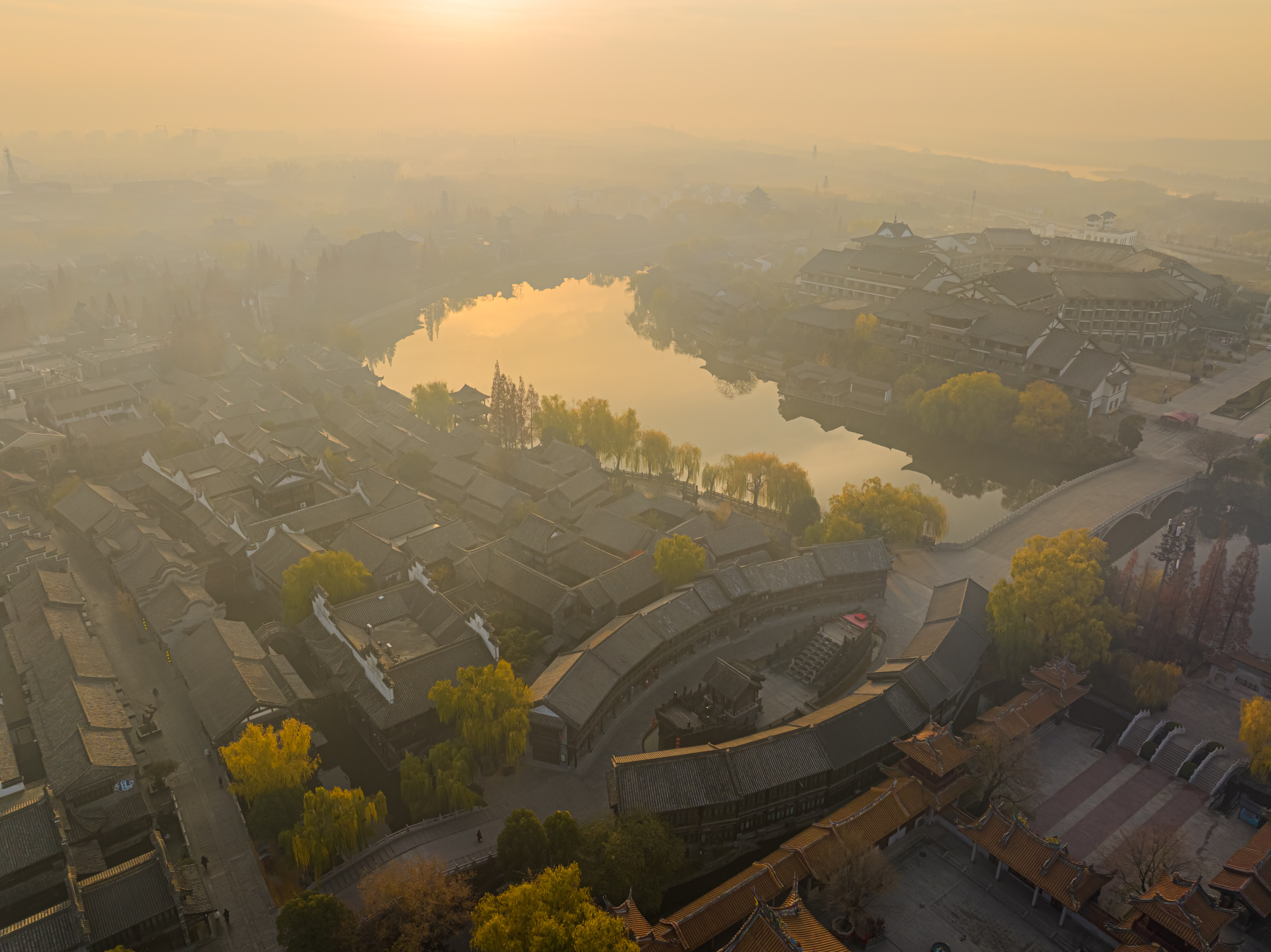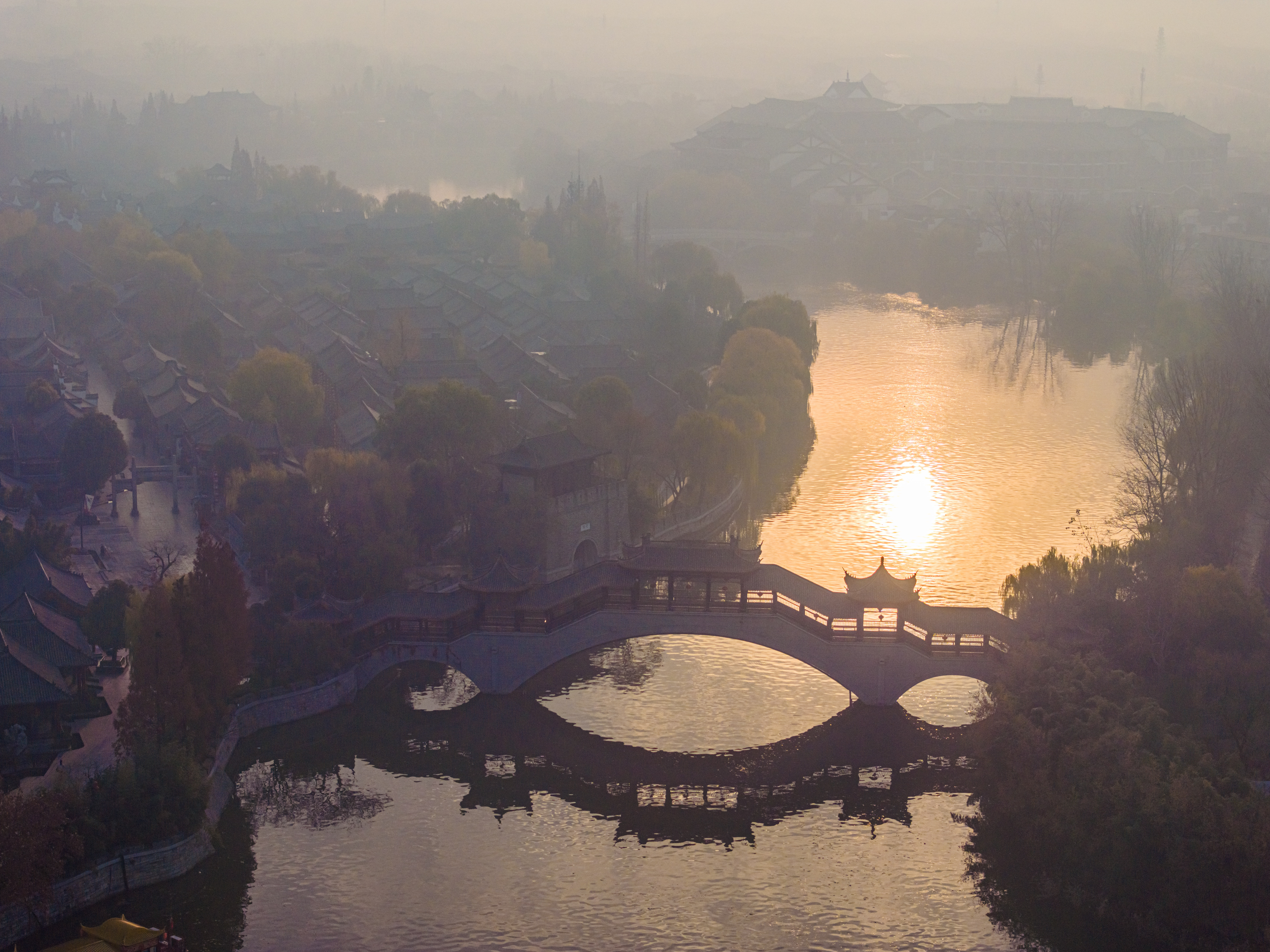 冬日的清晨,太阳刚刚升起,台儿庄古城仿佛被一层金色的光辉笼罩。阳光透过云层散射在古城上空,如梦如幻,让人感受到温暖和宁静。古运河与岸边的古建筑相映成趣,形成了一幅美丽的画卷。此时烟雾缭绕,整座城就像仙境一样,美不胜收。