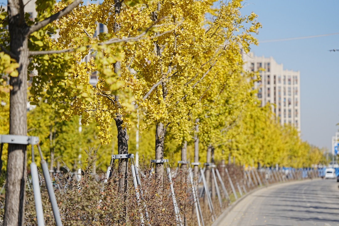 该道路为四幅路,路段长500米,种植5列银杏作为行道树,行道树连接带内间隔种植天鹅绒紫薇,中央隔离带内种植红花檵木增强道路韵律,机非隔离带内增加风雨兰“胖丽丽”延长道路花期,充分体现夏季观花、秋季观叶的道路特色。