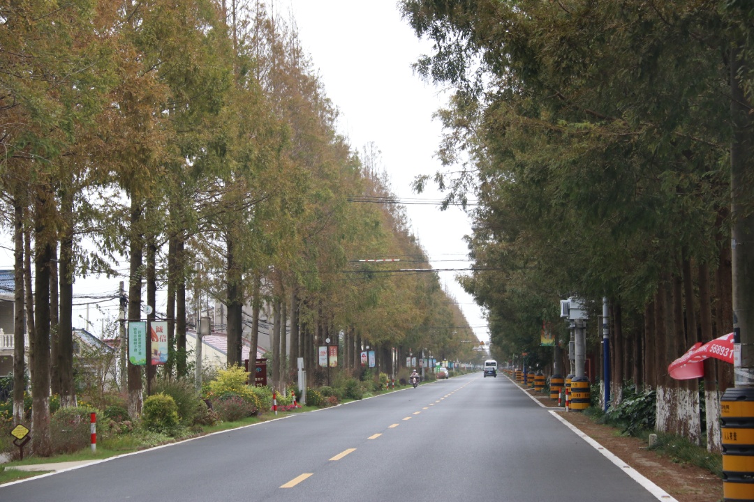 该道路为单幅路,是横沙岛居民的主要出入路,路段长1000米,行道树为水杉,树形美观,季相变化明显,下层配植造型瓜子黄杨、造型罗汉松、红叶石楠球、墨西哥鼠尾草、火焰南天竹、金叶串钱柳、紫薇、萱草、月季等植物,形成季相变化丰富,春季、秋季色彩各有特色的绿化特色景观。