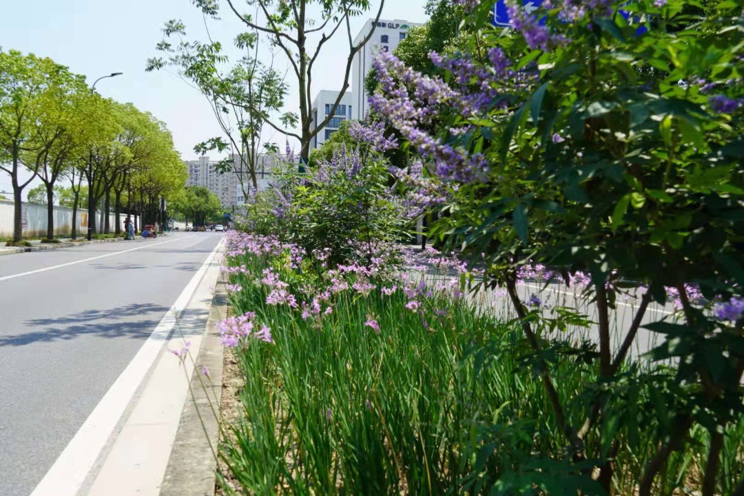 该道路为双幅路,路段长1100米,种植无患子、黄金楸作为中隔带行道树,形成上层植物,树形美观,搭配中层种植穗花牡荆,下层配植八仙花、紫娇花、百子莲等植物,形成蓝紫色的特色植物海洋,春夏季观花,秋季观叶,形成四季有景的特色绿地景观。