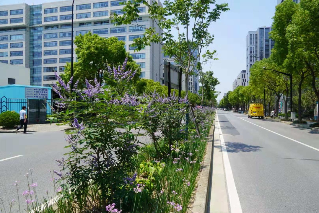 该道路为三幅路,路段长550米,道路运用色叶乔木榉树,道路中央花箱内种植四季草花彩叶草、角堇等,隔离带成规模种植北美海棠,地被种植宿根花卉黄金菊、百子莲,搭配开花植物樱花、垂丝海棠、紫薇等,形成冠大荫浓、花藤环绕其间的街道美景,营造一季有色,两季有花的道路景观,同时辅以浦江特色文化花箱,让城市可阅读、可休憩、可漫步。