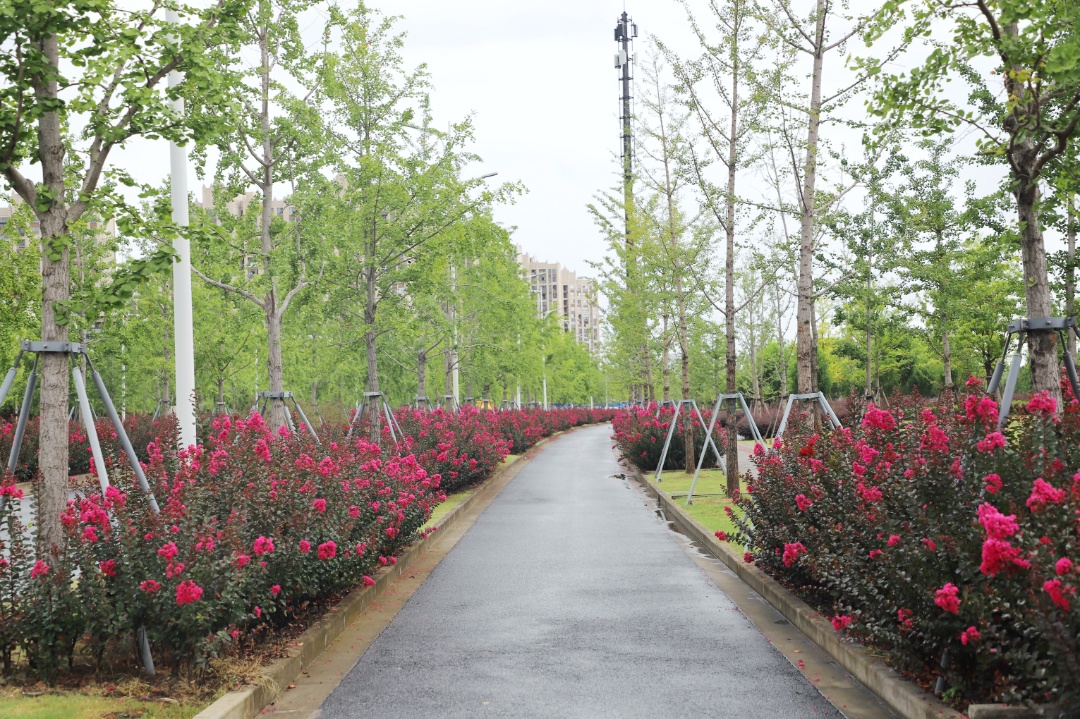 行道树为榉树,沿线机非隔离带中层种植北美海棠,下层主要种植红花檵木和安酷杜鹃,地被植物以常绿萱草和玉簪混植,呈现出“两季有花,一季有色”的景观面貌。