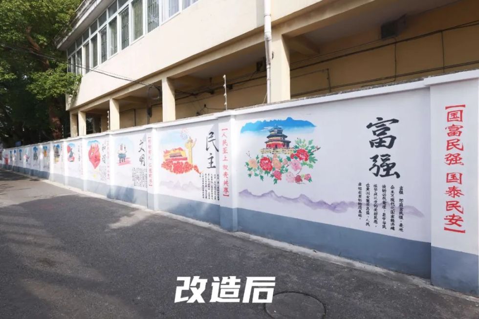 在南塘村村委会旁,清溪路北面道路两侧的墙面刷白、增加了墙绘,成为沿途靓丽风景线。