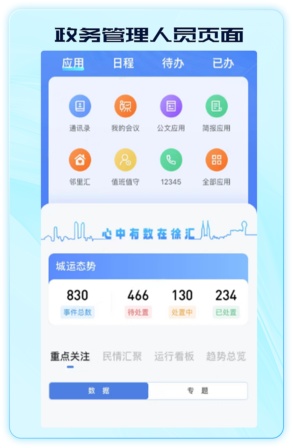 为贯彻落实市委、市政府关于加快城市数字化转型、打造上海市一体化办公平台的重要部署,徐汇区依托顶层设计,保持全局思维,不断创新突破,深入挖掘徐汇特色,将徐汇区一体化办公平台从传统办公应用场景向城市治理和政府服务方向扩展,上线“政务管理人员页面”和“普通工作人员页面”。坚持问题导向、需求导向,“政务管理人员页面”聚焦重点工作及职责分工,挖掘有价值数据,设计展示场景,落实数据追踪溯源,以数据驱动应用业务整合,扫除管理盲点和业务问题,推进政府效率提升,切实辅助决策支撑。