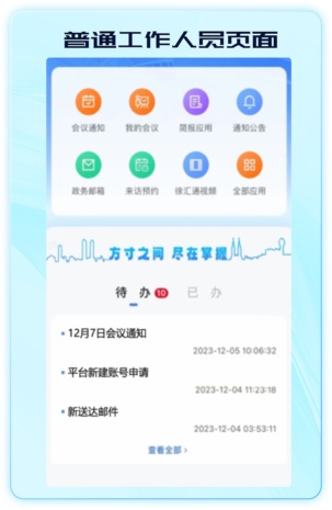 普通工作人员可根据业务属性和个人喜好自定义“工作台”,强调“千人千面”。平台在实现政务邮箱、视频会议、公文处理、会议管理、简报专报、督查督办等通用办公应用基础上,通过区级协同中枢平台,实现与市一体化平台的公文、会议、简报等功能互通,实现市区公文传输高效协同。同时,增加待办、订阅、定制和快捷访问,工作人员可根据职责分工及业务需要,自定制页面,提升使用体验和政务办公效率。