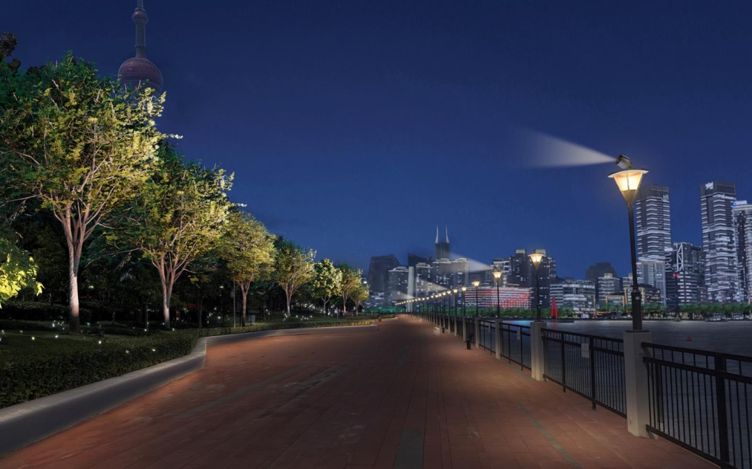 通过原有灯杆改造加装景观照明设施,既确保了滨江景观视觉元素的一致性,又实现了景观照明和功能照明兼顾的照明效果,立杆挑高又使树冠亮度显著提升,大大增强了浦西侧观赏陆家嘴夜景的视觉体验。