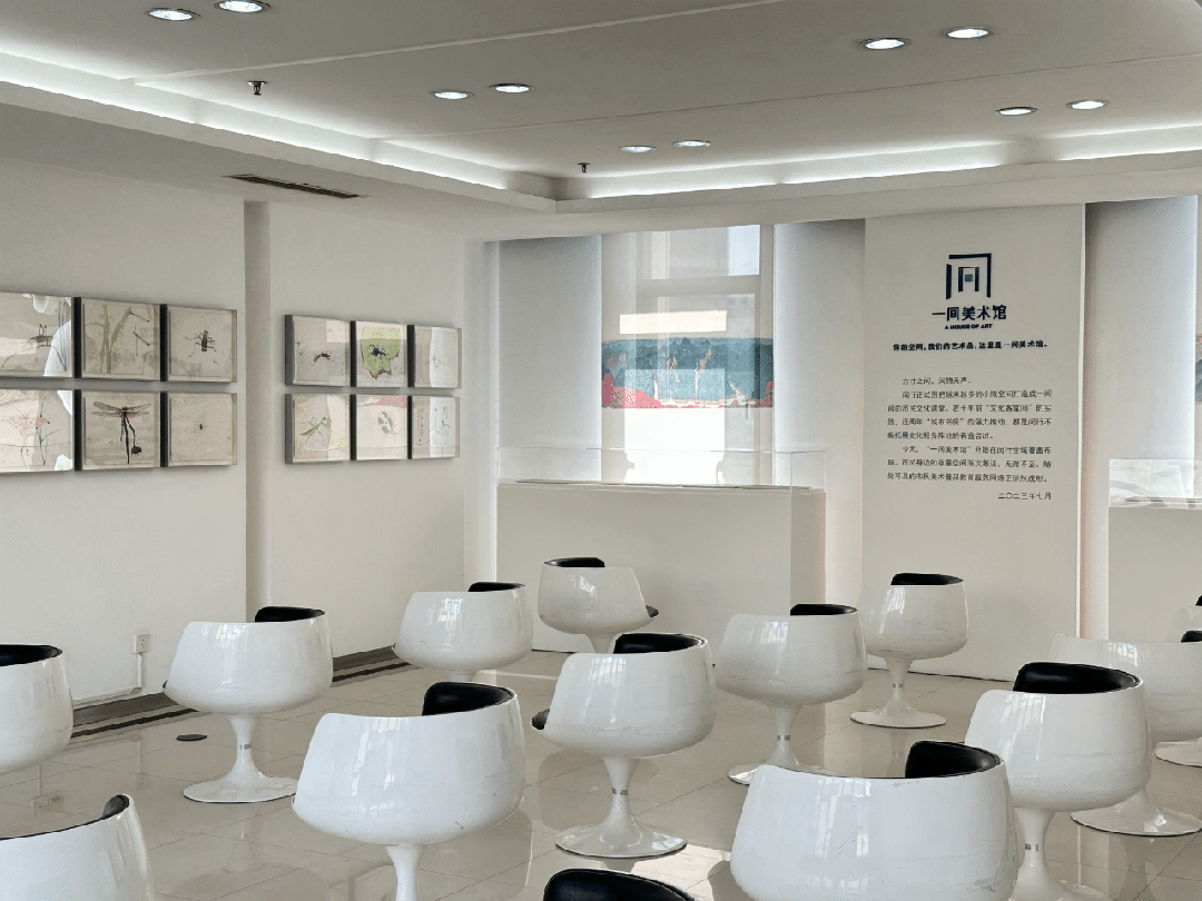 在闵行区图书馆八楼,原有50平方米左右的灰白墙面空间被升级改造为小型美术展厅,集中展示了新海派水墨画大家陈家泠先生的《花鸟鱼虫》系列作品,为来往观众呈现出自然透亮、清冽宁静的视觉感受。