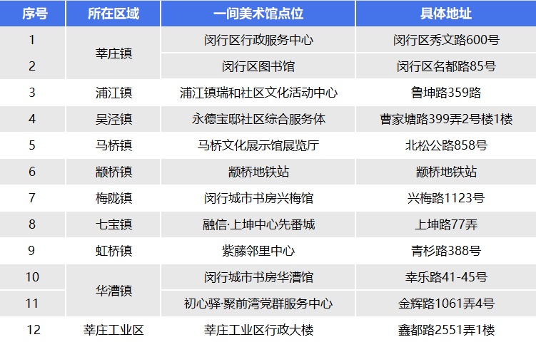从解决人民群众最关心、最直接、最现实的利益问题出发,2023年区政府为民办实事项目涵盖宜居宜业、便民养老、就医就学、品质生活等重点领域。记者从区文旅局获悉,以上海市“15分钟社区生活圈”建设为工作指引,闵行今年全力实施新建“一间美术馆”为民办实事项目,共建成12家“一间美术馆”,超额完成年度目标任务。无微不至、随处可及的市民美术普及教育服务网络,正在闵行悄然成形。