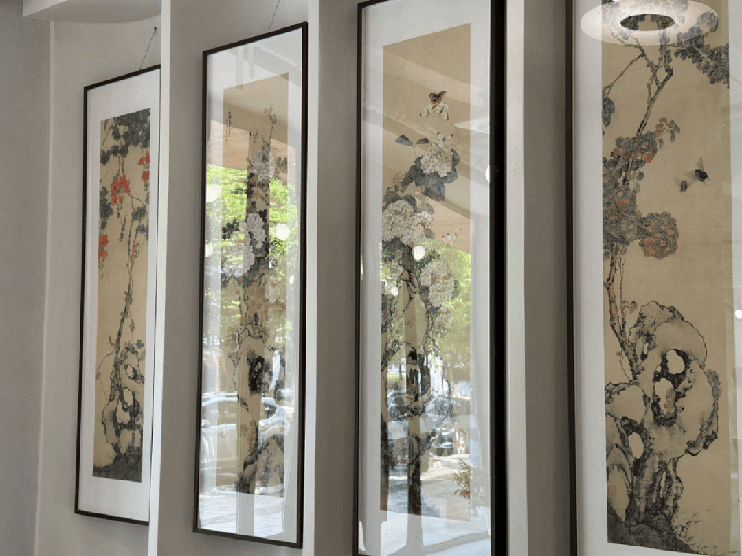 闵行城市书房华漕馆定位为新一代国际化未来书房,该馆以温馨自然的水绿色、浅米色、明橙色为主色调,包含城市客厅、城市长廊、儿童阅览区、成人阅览区等功能分区。《草虫花卉湖石四屏》等设色妍丽、笔致工整的“苗条”书画作品与弧形墙面无缝融合,打造出兼具古典美与现代感的“双重画风”。