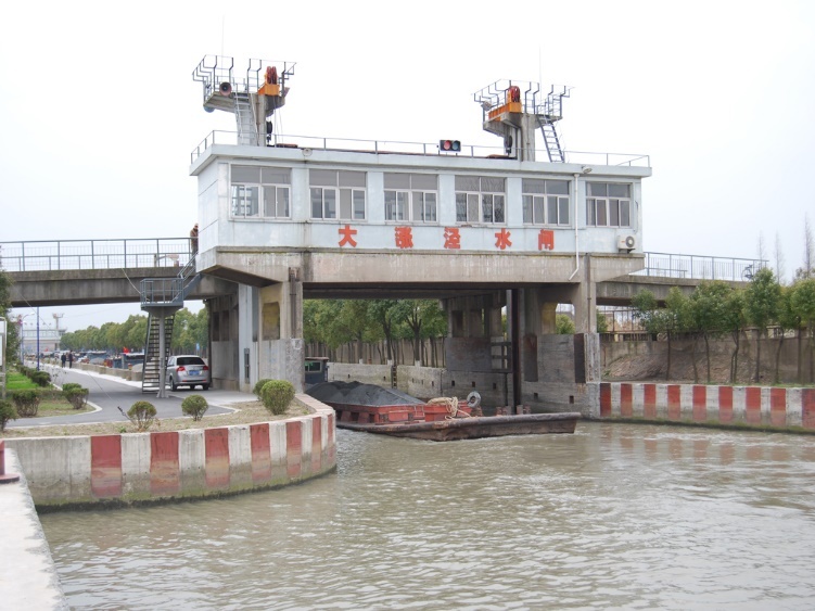 大涨泾水利枢纽控制运行的依据为:汛期闸口水位控制范围为2.10-3.10米,非汛期闸口水位控制范围为2.20-3.30米,最大排水流量60立方米/秒,通航等级100吨。