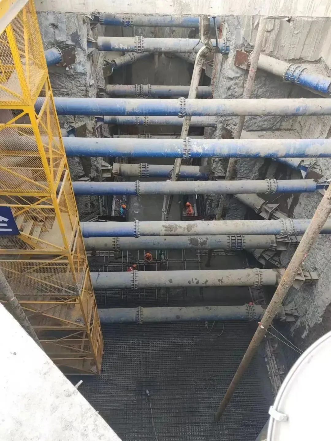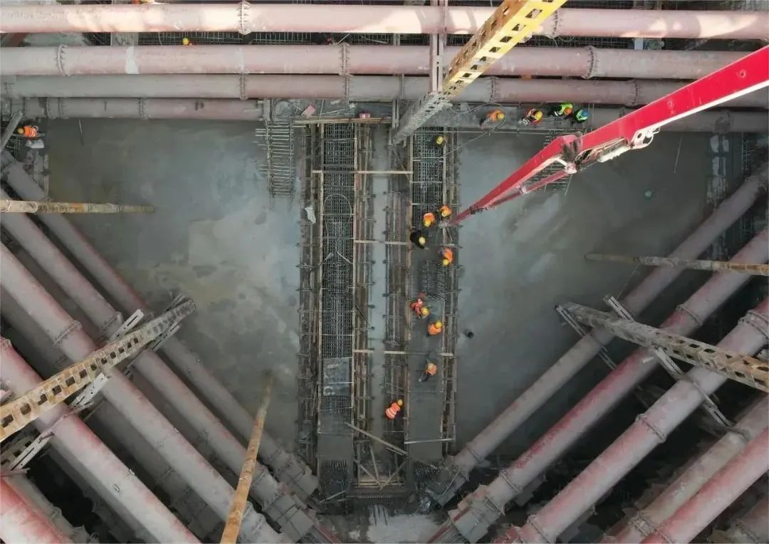 此次开挖的1区基坑开挖深度约28.79米,采用明挖顺作法施工。基坑内共设置八道支撑,第一、第四道为钢筋混凝土支撑,其它均为钢支撑,采用全伺服轴力系统实时监控,有效控制基坑变形。目前,金园五路站1区基坑正在架设第四道支撑,项目团队将通过优化工序衔接,严格控制基坑开挖暴露时间,确保基坑开挖工作顺利完成。