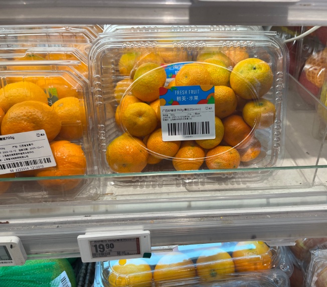 记者来到盒马鲜生南洋1931店,来自广西桂林的砂糖桔已经上市,售价为19.9元/950g,在盒马App中也可选购3~5斤的纸盒装。