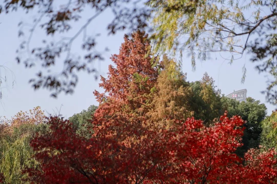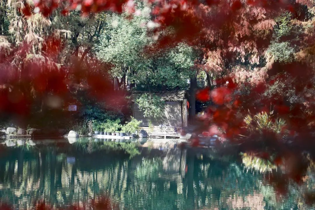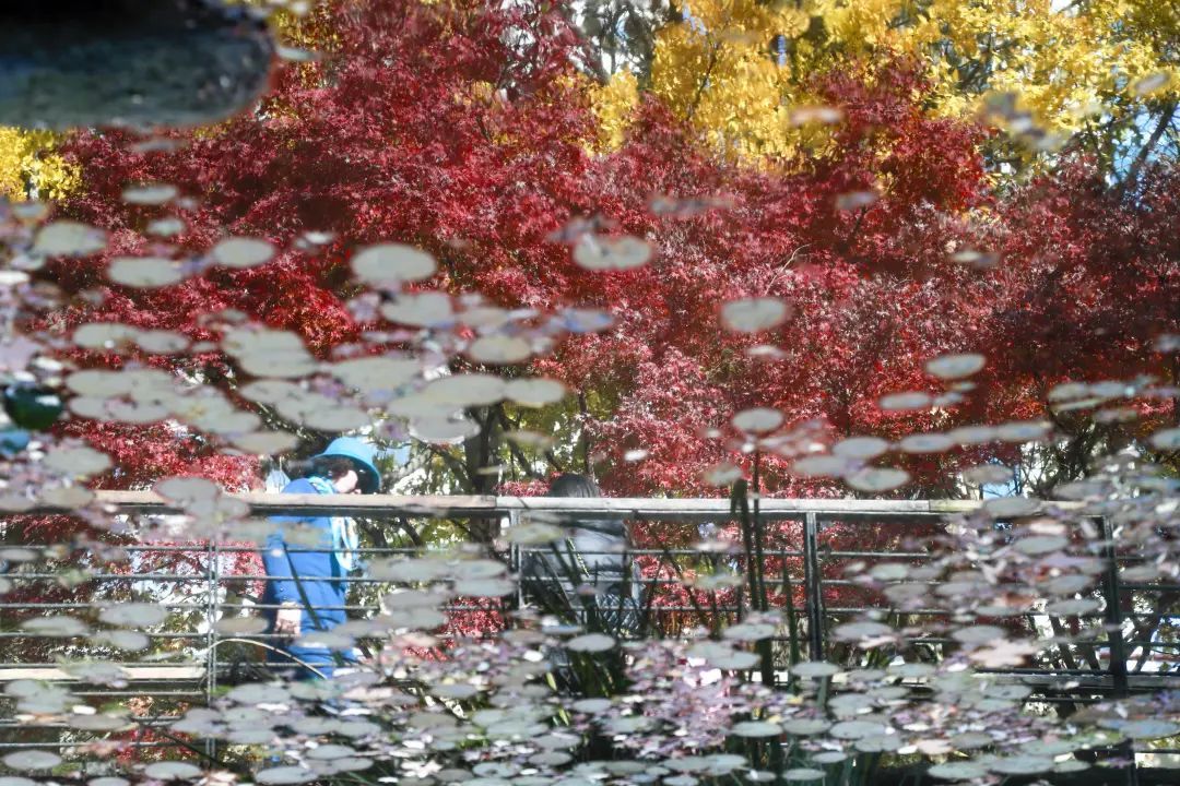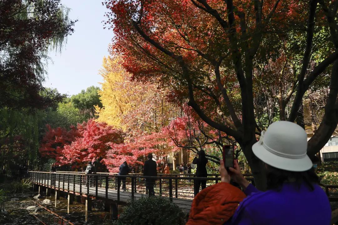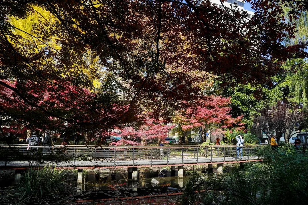 站在金陵中路与黄陂南路路口,一眼望去,藏不住的红夺人目光。午间的阳光穿过枝叶,越过银杏的黄,穿过青葱常绿的林间,或是在空中摇曳,或是在草坪与光影作画,而池塘水面上漂着的星星点点,一时分不清是倒影还是落叶。漫步在廊桥,抬头看是一幅油画,低下头是被稀释的调色盘。