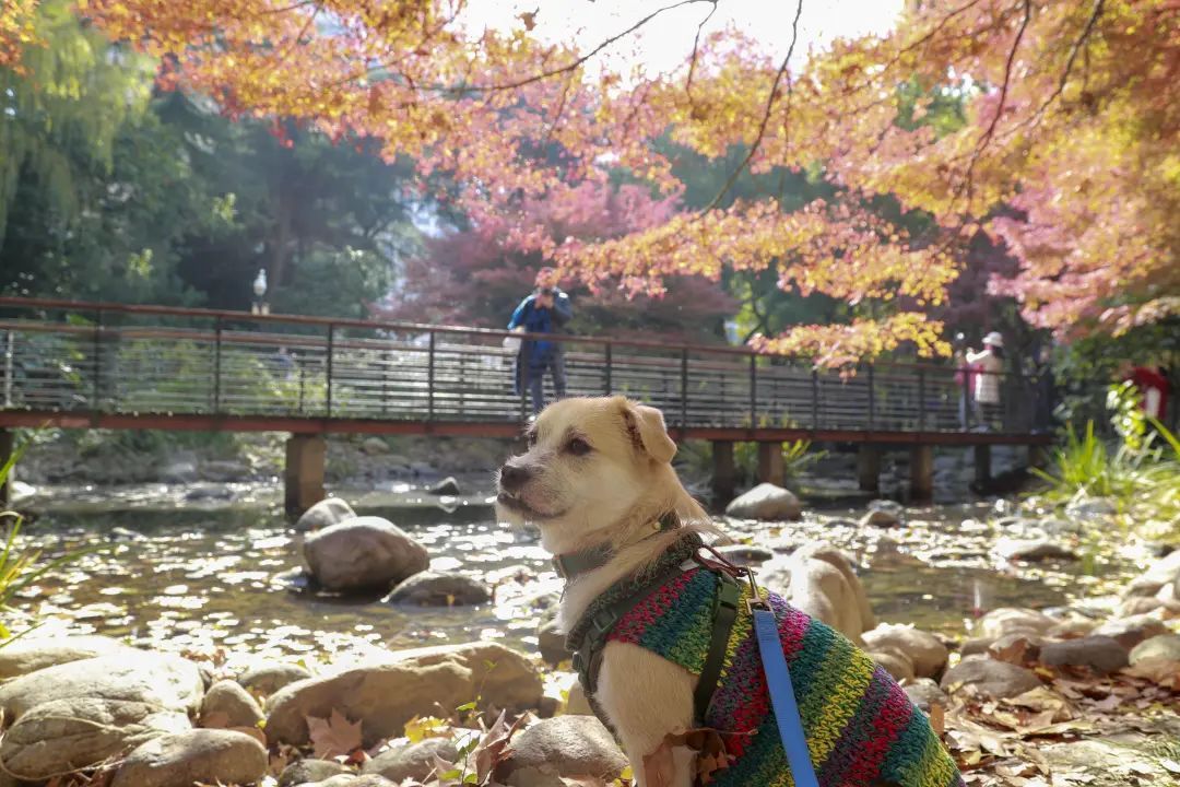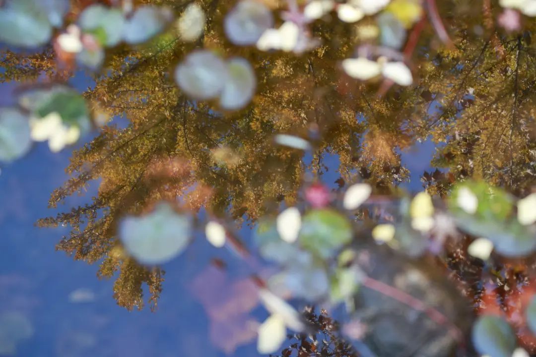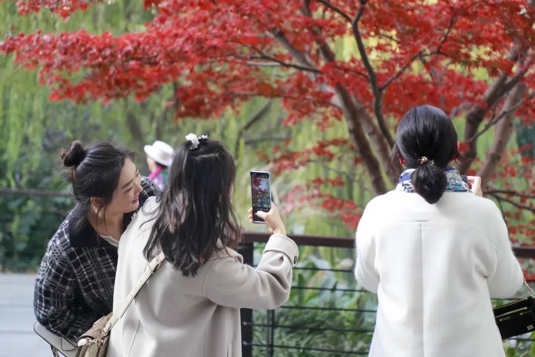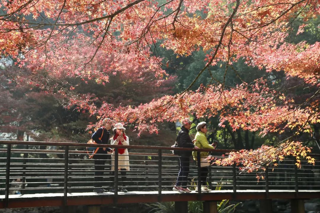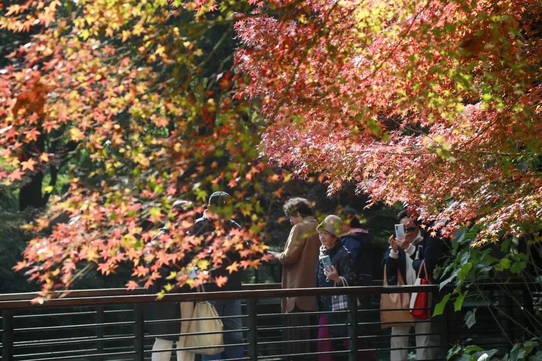 站在金陵中路与黄陂南路路口,一眼望去,藏不住的红夺人目光。午间的阳光穿过枝叶,越过银杏的黄,穿过青葱常绿的林间,或是在空中摇曳,或是在草坪与光影作画,而池塘水面上漂着的星星点点,一时分不清是倒影还是落叶。漫步在廊桥,抬头看是一幅油画,低下头是被稀释的调色盘。