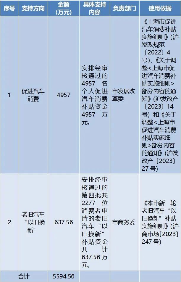 1、按照《上海市促进汽车消费补贴实施细则》(沪发改规范〔2022〕4号)、《关于调整<上海市促进汽车消费补贴实施细则>部分内容的通知》(沪发改产〔2023〕14号)和《关于调整<上海市促进汽车消费补贴实施细则>部分内容的通知》(沪发改产〔2023〕27号)规定,安排经审核通过的4957名个人促进汽车消费补贴资金共计4957万元。
