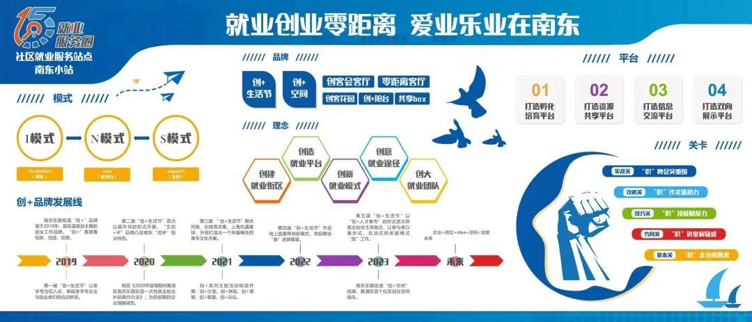为进一步提升公共就业服务品质,南东社区就业服务小站在做好6大服务模块基础上,持续完善社区就业创业服务体系。站点围绕1个目标、2个品牌、3个模式、4个平台、5个关卡的布局定位,全方位多角度沉浸式开展就业创业综合服务,并且结合辖区内就创企业与人才资源,总结形成了三大特色模式(简称“ins”模式),即:“小”红书“大”事业达人孵化模式(incubation)、“老字号 新活力”创新玩法促就业模式(new)、“Young”帆起航大学生创业支持模式(support),通过不断注入新想法、新元素、新活力,为就业者、创业者以及企业提供全周期“一站式”精准服务,真正实现就业创业零距离,乐业爱业在南东。