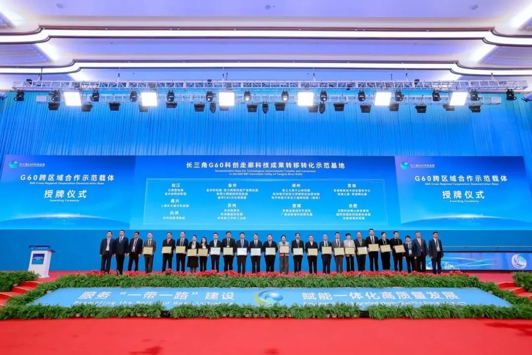2023年11月8日下午,第六届中国国际进口博览会2023长三角G60科创走廊高质量发展要素对接大会在国家会展中心举行。会上,上海交大嘉兴科技园被授予第二批长三角G60科创走廊科技成果转移转化示范基地。