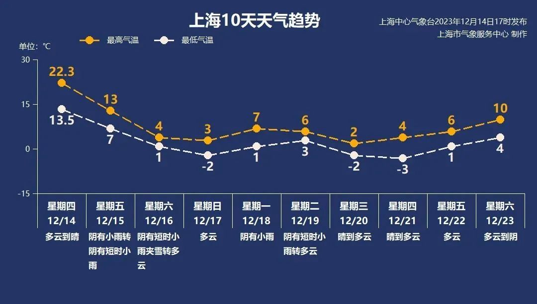 上海中心气象台2023年12月14日17时00分发布寒潮蓝色预警信号:受北方强冷空气影响,本市气温将明显下降,48小时最低气温降幅可达11-13℃,17日早晨最低气温市区零下2℃左右,有薄冰,郊区零下6℃到零下3℃,有冰冻或严重冰冻,请注意防范大风、强降温及持续低温带来的不利影响。