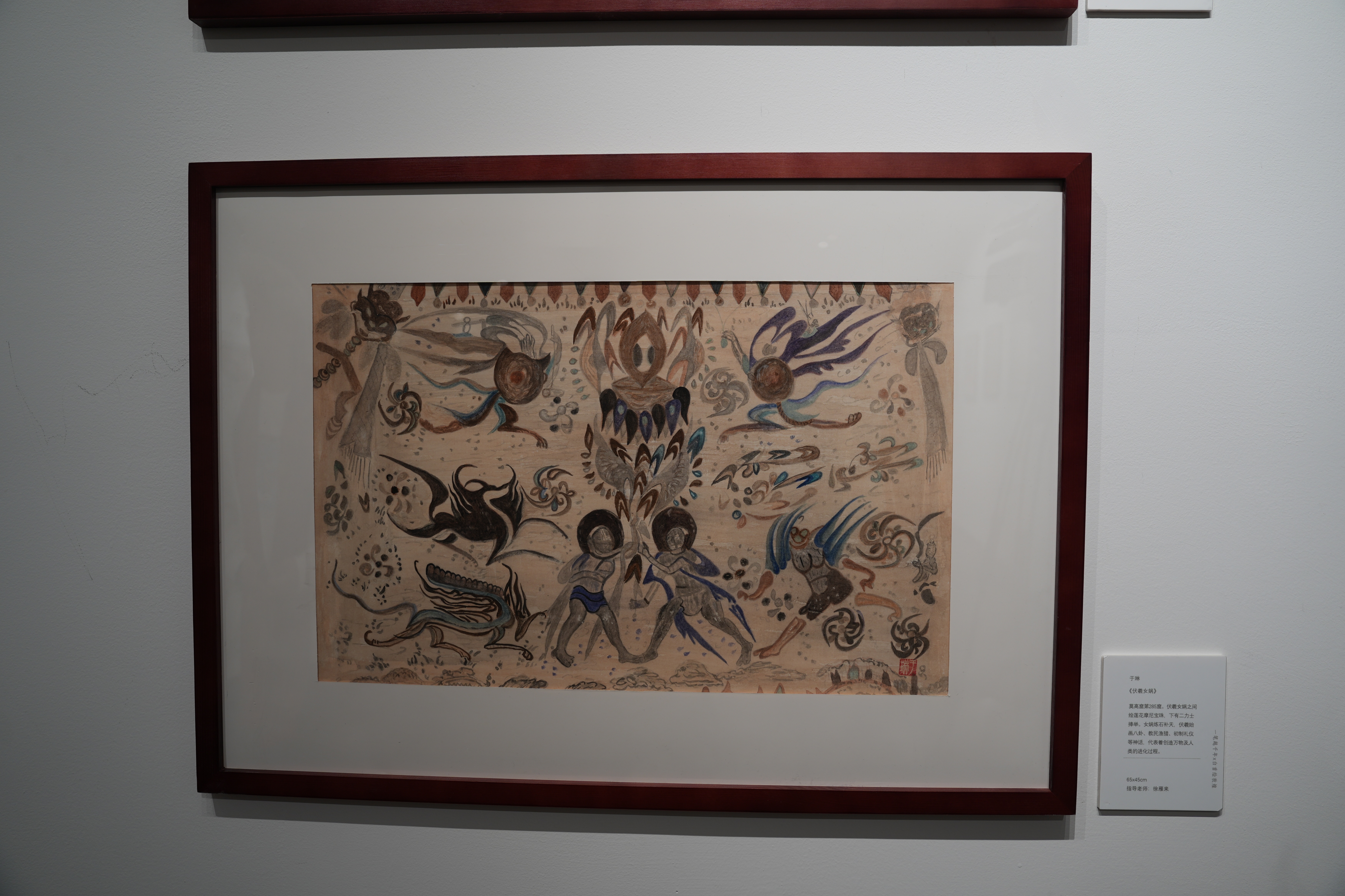 8幅参展作品中,于琳最满意的一副作品名叫《伏羲女蜗》,已经学习绘画三年的她从一窍不通到现在能运用较为熟练的笔触和丰富的色彩,将壁画中的宝莲灯、飞龙与斑驳的花纹展现得纤毫毕现,她开心地说:“学习画作的过程是快乐的,而且比较容易上手,我非常欢迎退休老人加入我们的‘乐龄’绘画大家庭。”