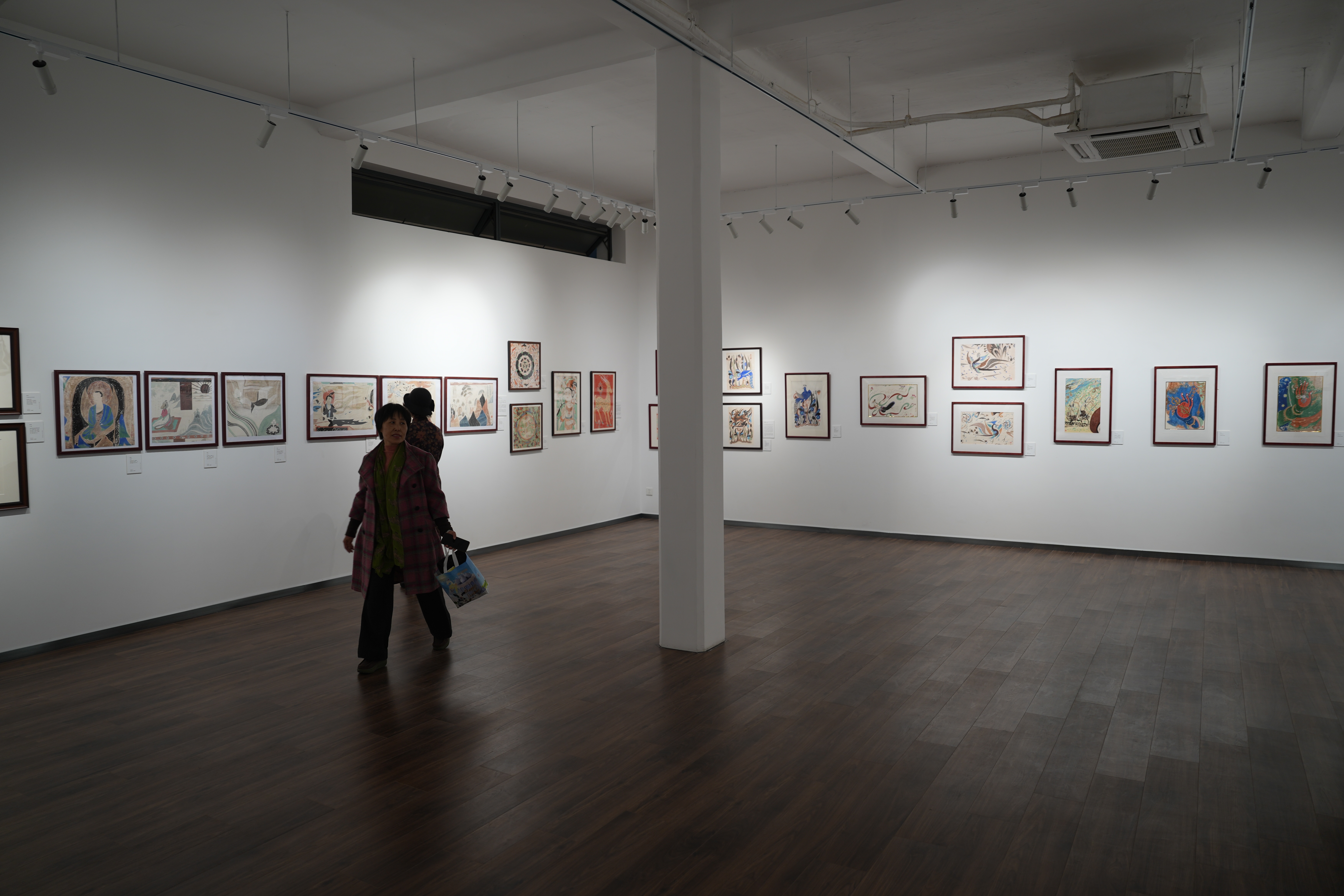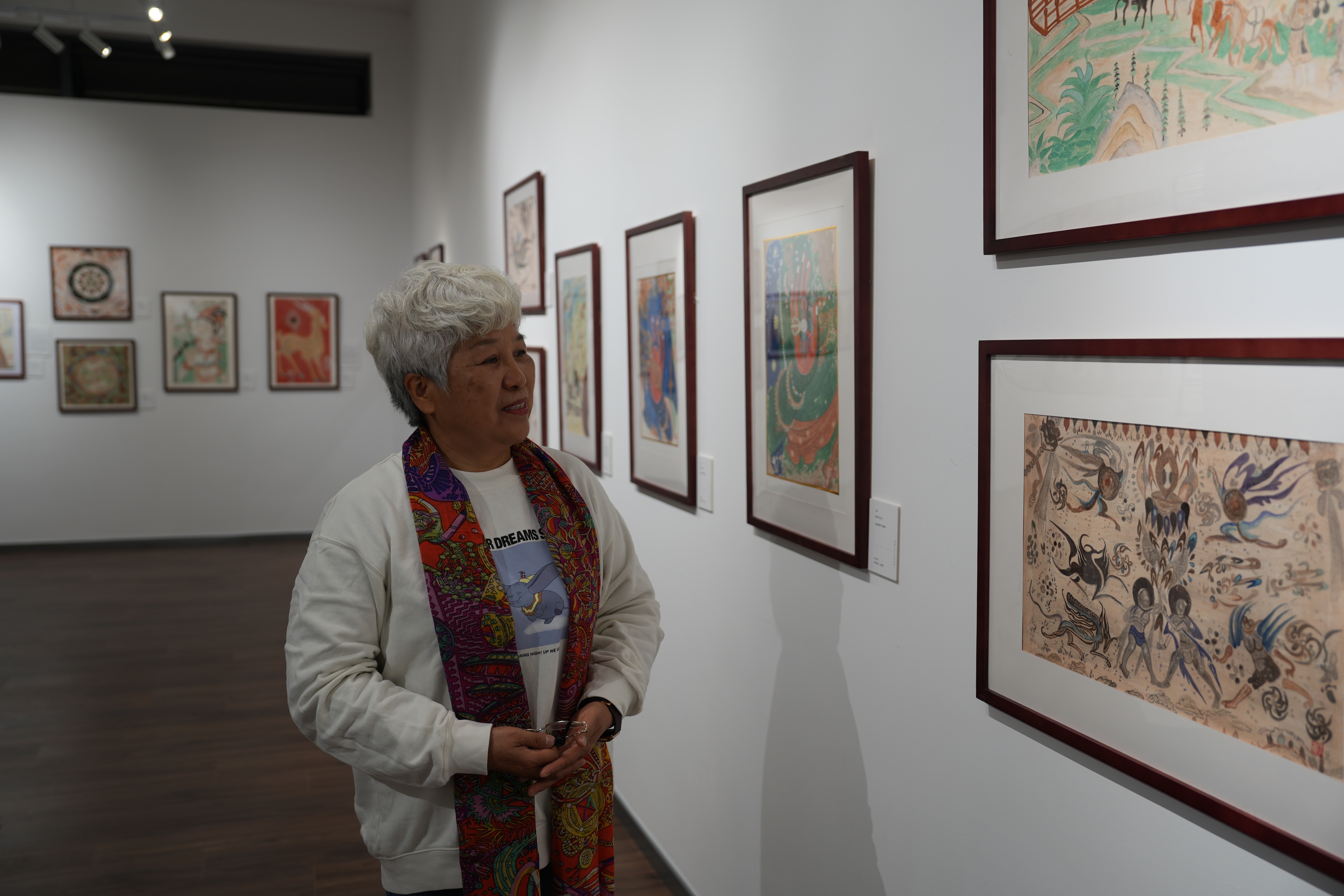 已逾花甲之年,满头白发看起来精神矍铄的于琳是这次携带画作最多的画家之一,本次她带着8幅画作来参展,当谈到她的绘画经历时,她滔滔不绝,“我一直对敦煌艺术很感兴趣,但从未有机会亲眼看到这么多精美的作品。通过和学员一起学习,激发了我的创作灵感。”