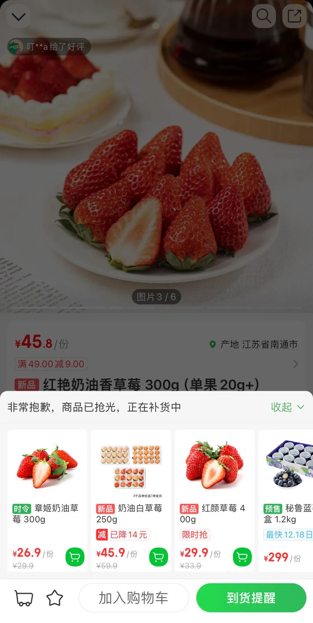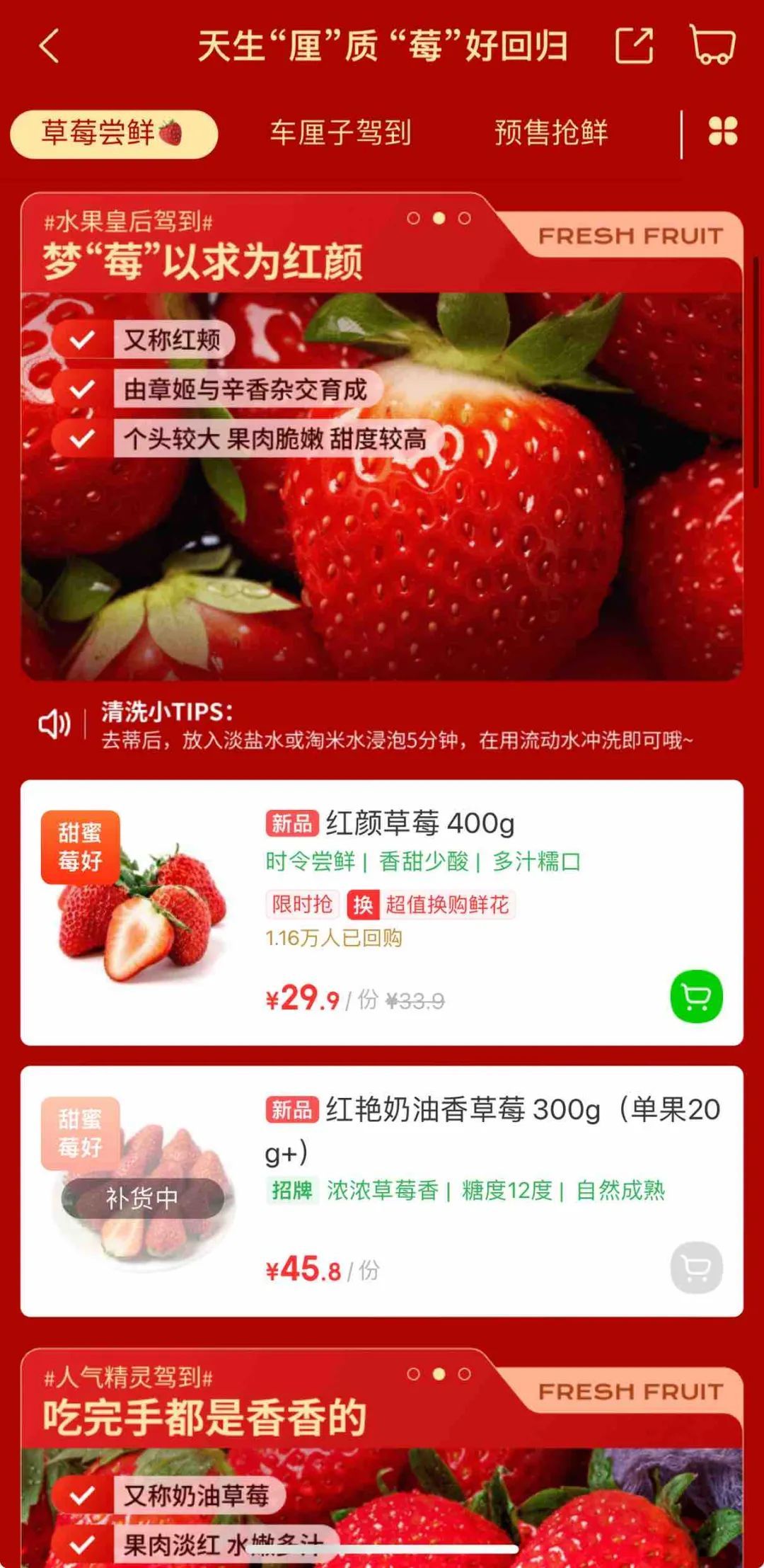 草莓在线下市场的火爆热销同样也延续到了线上平台,在叮咚买菜APP上,草莓的热度居高不下,直接火上了叮咚热搜榜。