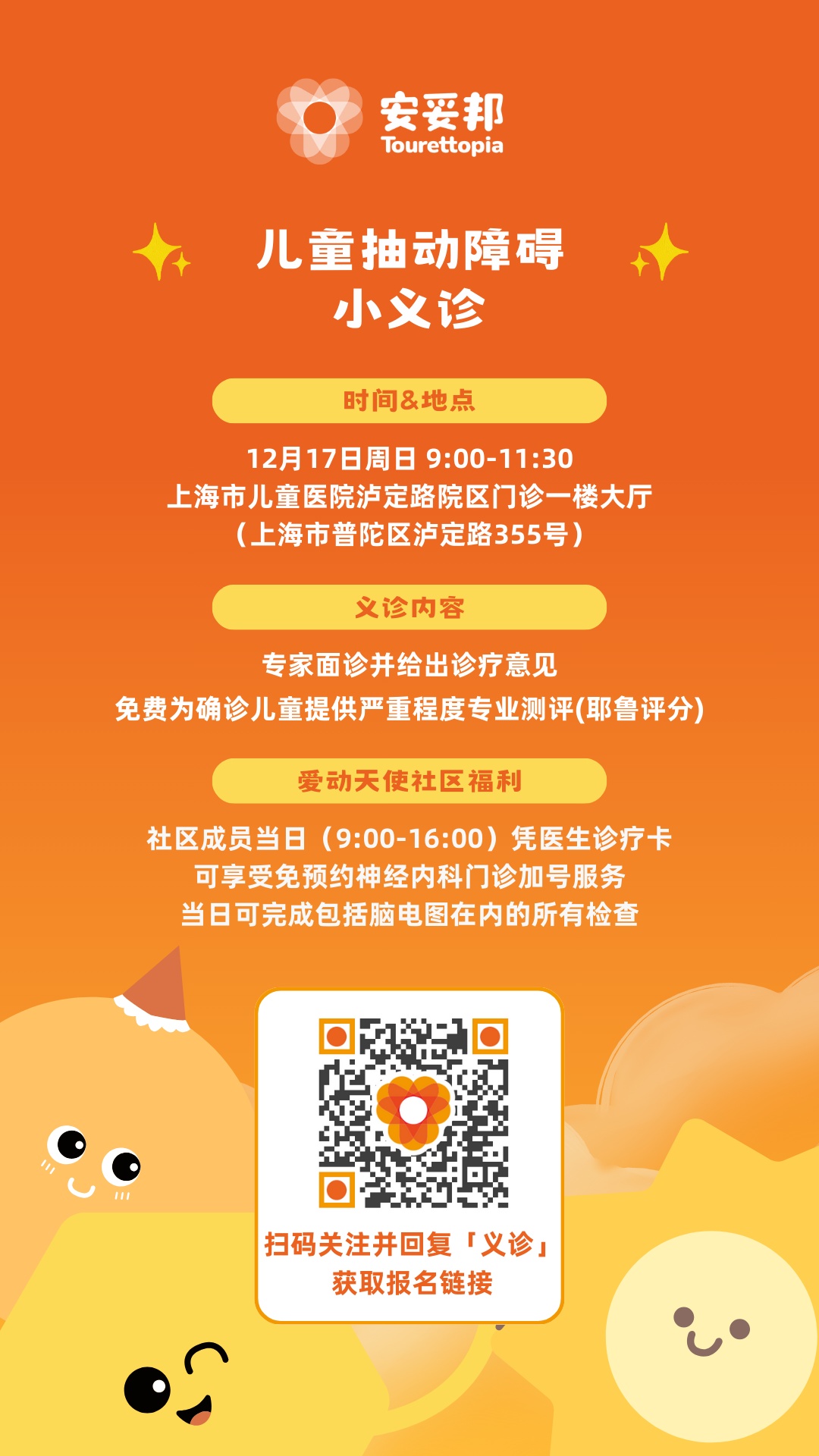 由上海市儿童医院神经内科作为执行医疗机构的抽动障碍公益项目安妥邦线下义诊,专家一对一免费面诊并给出诊疗意见,助各位家长朋友们准确了解孩子情况,扫码即可预约报名,名额有限,先到先得!