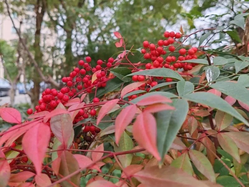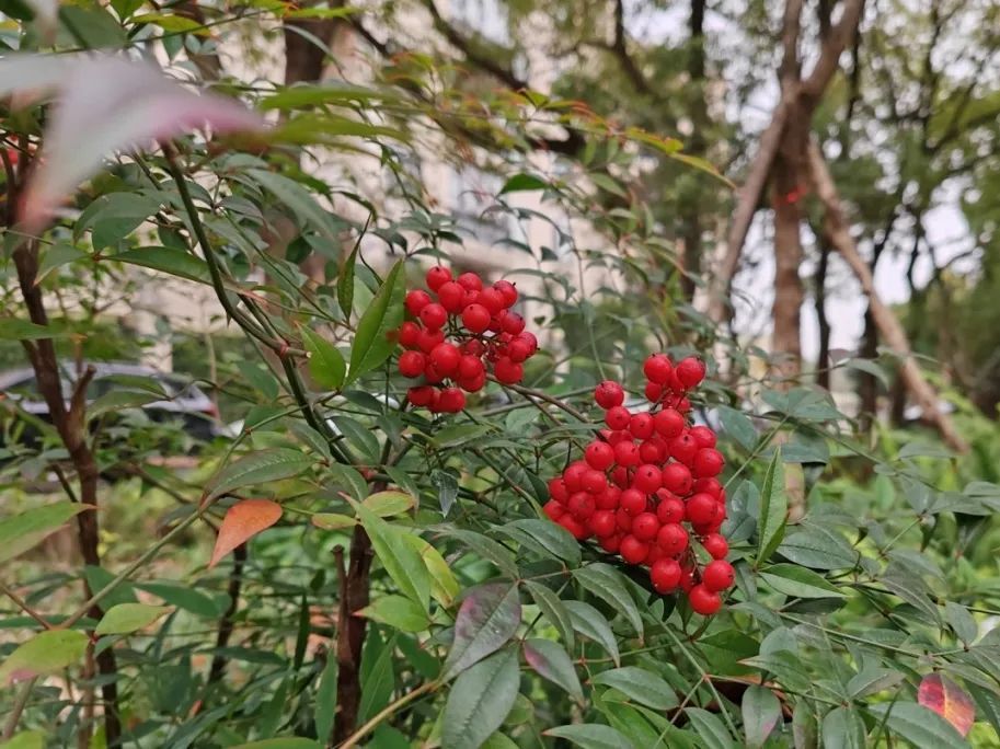 在中山公园和“融·生境花园”里,记者发现了几处艳丽秀气的南天竹。一丛丛绿叶中,如珊瑚般光泽鲜亮的鲜红果实尤为突出;同时,南天竹的部分叶片也会在秋冬季渐变为红色,层次丰富,极具观赏价值。