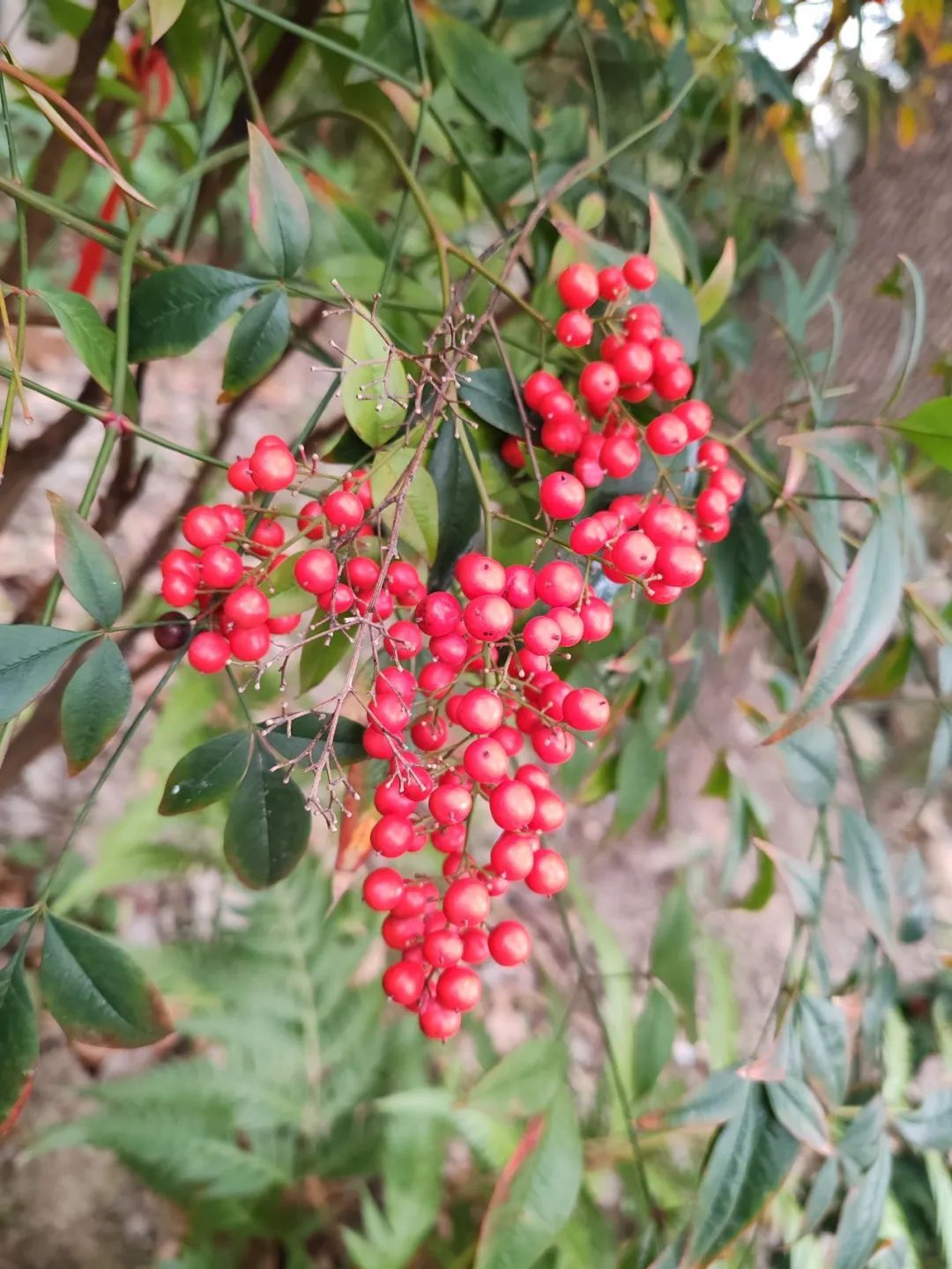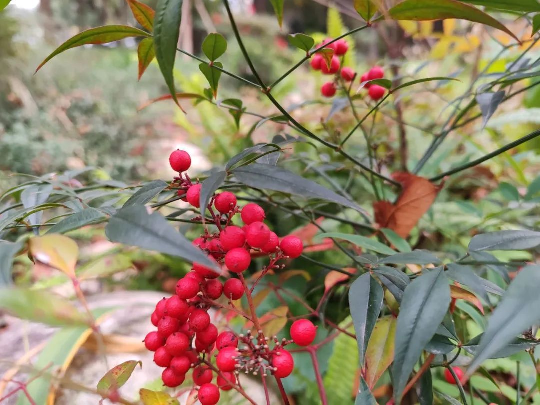 在一片片多彩的树叶中,南天竹的身影并不打眼。尽管火红的颜色鲜艳非常,但南天竹的果实直径不到一厘米,十分小巧。一簇簇“红果果”躲在绿叶下,很容易被人忽略。但是,一旦发现了它的踪迹,这抹“火红”便会令人心生喜悦。