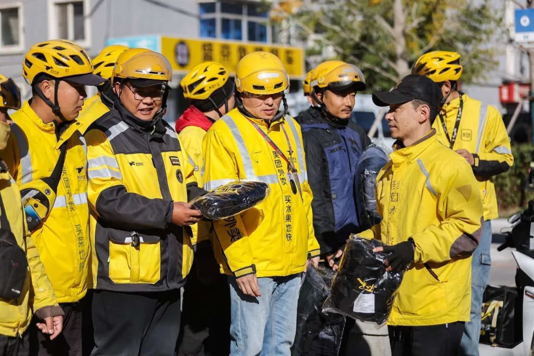 为迎接降温天气,美团外卖提前做好骑手配送安全和防寒保障,包括在站点为骑手发放防寒物资包、冬季工装装备以及保温杯、暖宝宝、姜汤、热茶等实用物资。今年防寒物资发放前,美团外卖通过发放问卷、召开恳谈会等方式征集骑手需求,除了常用的电动车挡风被、车把套、手套、护膝、保温杯等,还增加了暖宝宝等实用物品。
