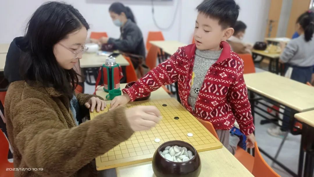 围棋老师结合孩子们的实际情况,从围棋吃子手段等技艺知识讲起,由浅入深启发孩子们对围棋的学习兴趣,老师趣味性的互动式教学模式,让他们在快乐中接触知识,在欢笑中体验文化,培养青少年的主动思维能力。讲完理论知识紧接着实战练习,孩子们或两两成组、或与家长一组开始下棋,凝思静坐,继而执白捏黑,落子有声。