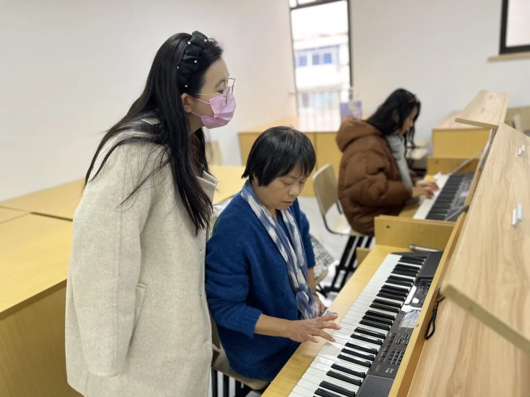 老师先对上一次的课堂练习进行了检查和辅导,接着根据每个人不同的熟练程度进行了差别化的指导,然后将《我和我的祖国》这首曲目进行了拆分和简化,让零基础的居民也能顺利上手。居民们都听得非常认真,记着学习笔记,按照老师一对一的指导反复弹奏练习,教室里传起了此起彼伏的悠扬弹奏声,她们都开心地表示:“从零基础到现在居然能弹奏起完整的片段乐章,太惊喜了,成就感满满!”