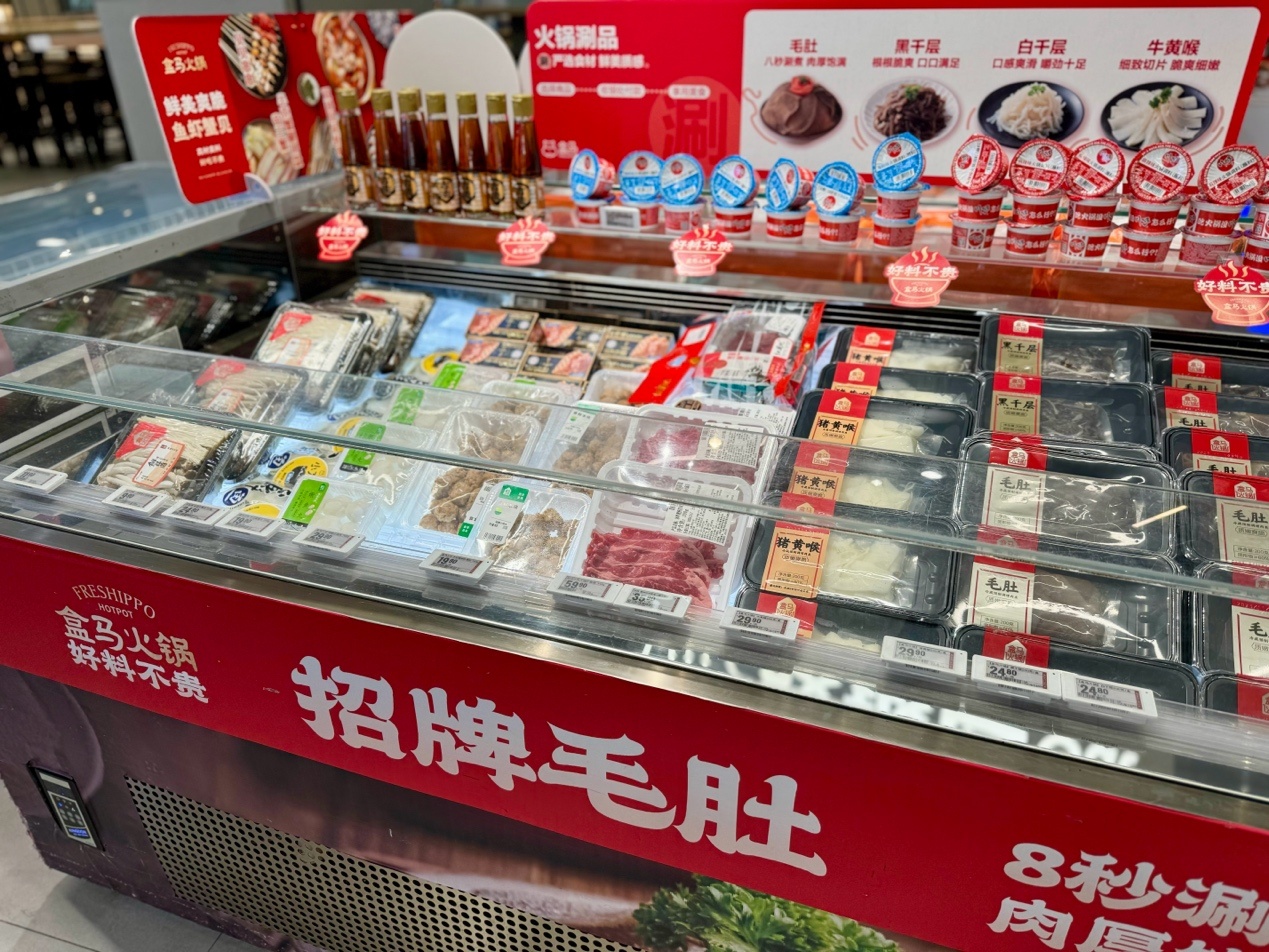 除了菜肉蛋奶这些基础民生品,寒潮天气还刺激了火锅、汤煲等商品的销售增长。盒马数据显示,周末两天的火锅销售环比大幅增长,美蛙火锅环比303%,老北京羊蝎子锅增长了212%,牛肉清汤锅底增长157%。而安格斯牛肉火锅片、牛奶鸭血、牛黄喉、毛肚、羔羊胸腹火锅肉卷成为“盒区房”用户最喜欢的涮品。