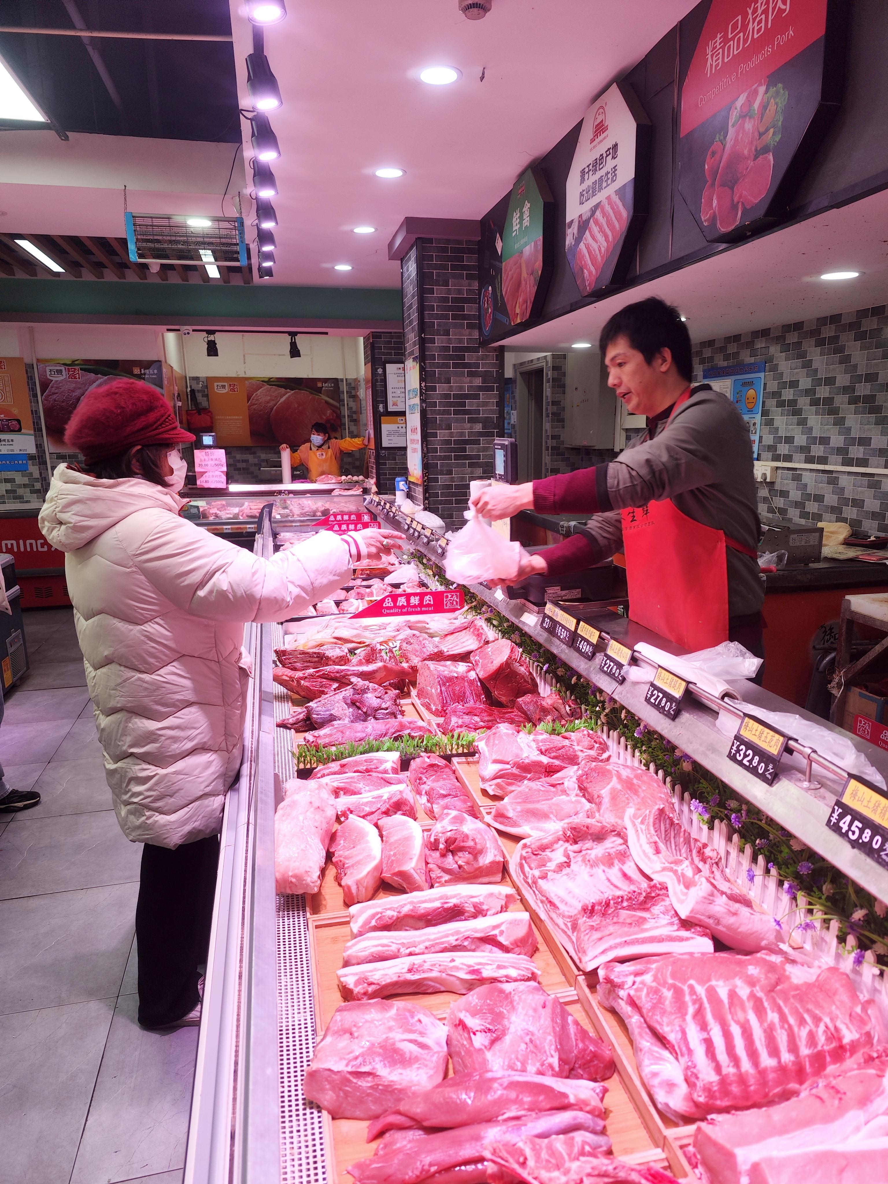 在猪肉专柜,这里的人气也颇旺。营业员表示,与之前相比,最近肉价也有所下调。猪肉柜上,商品价格也很实惠,猪夹心9.9元/斤,猪小排9.8元/斤,猪大排16元/斤,五花肉18.00元/斤,吸引不少顾客购买。居民王阿姨说:“最近天冷了,家里正在读小学的孙子说想吃大排和蹄髈,我特地来这里来买,准备做一个红烧大排和蹄髈汤给他补补身体,增强抵抗力。”