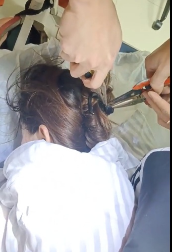 消防救援人员立即赶到现场了解到,一女子发生车祸时,由于头部受到猛烈撞击,其后脑勺的头皮被鲨鱼夹扎破,且插入部分较深,必须尽快将夹子取下,才能进行下一步治疗。